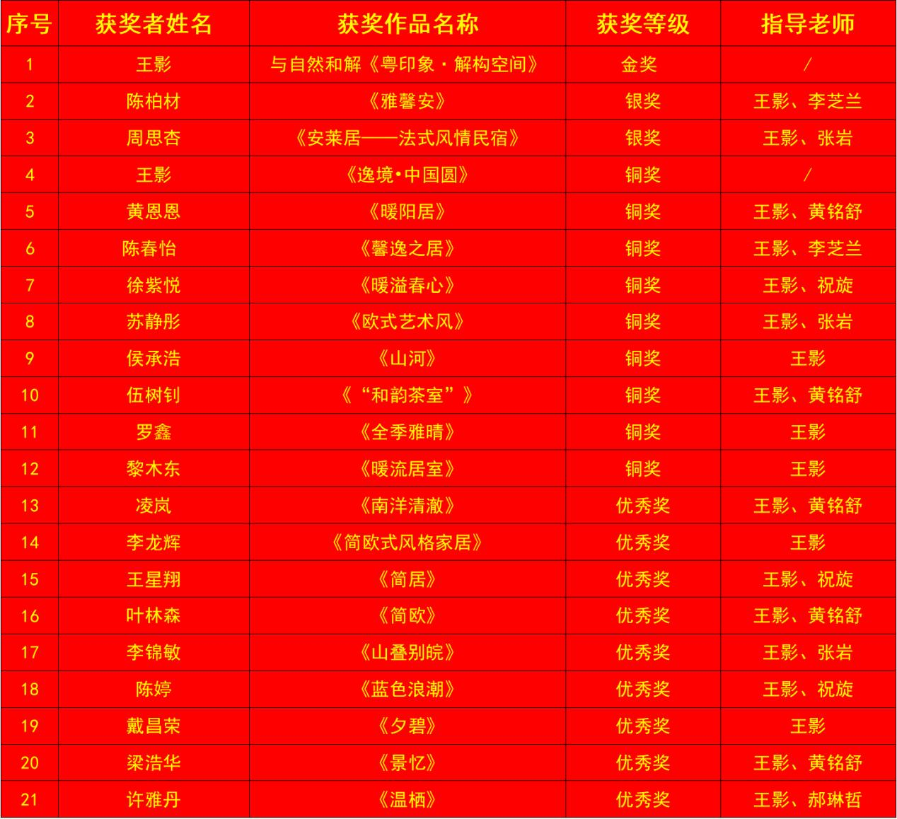 近日,由国际青年美术设计协会、亚太青年美术设计研究院主办的国际赛事——第四届ICAD国际当代青年美术设计大赛公布比赛结果,我校计算机与信息工程学院室内艺术设计专业师生斩获佳绩。其中,我校师生荣获金奖1个、银奖2个、铜奖9个、优秀奖9个,共计21个作品获奖,学校荣获“最佳组织单位”,王影老师荣获“优秀指导教师”。