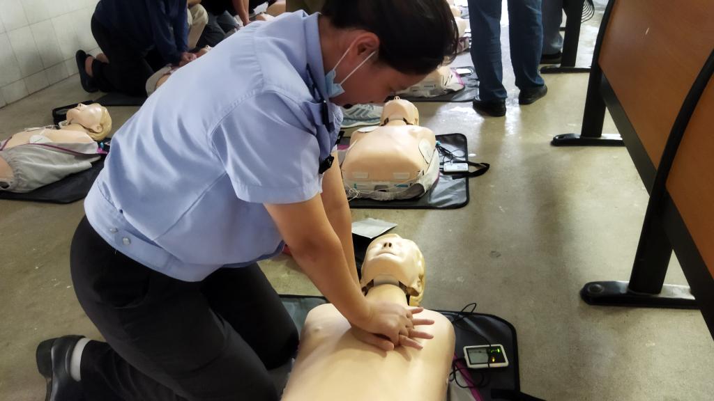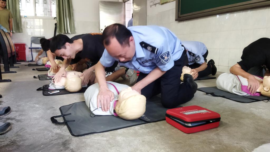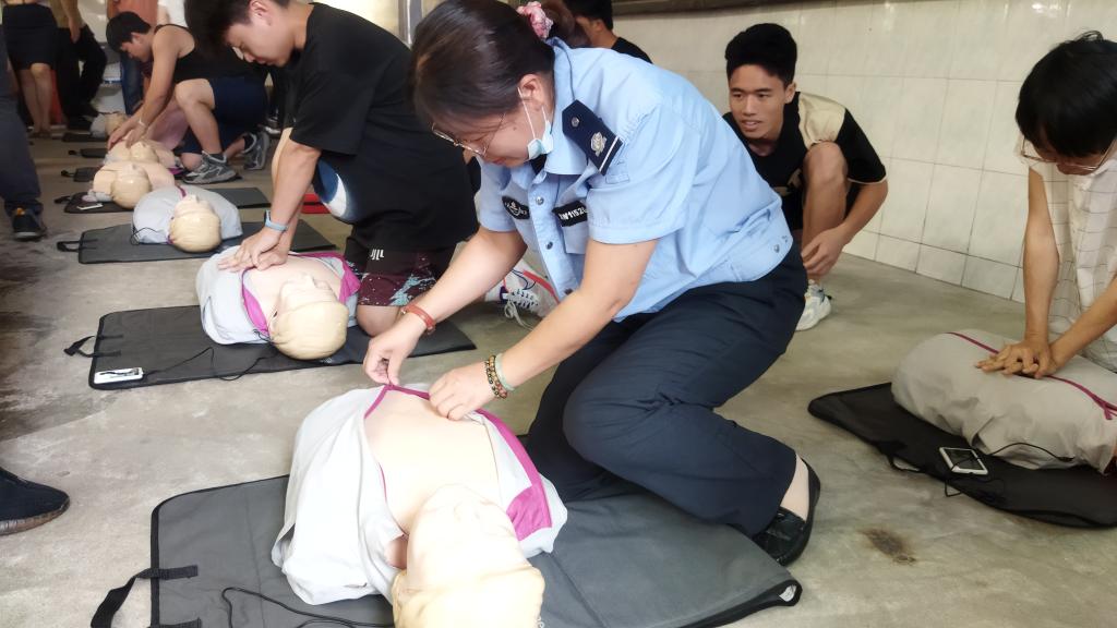 本次培训聘请的韶关市应急救护指挥中心讲师,通过理论讲解、视频教学、示范操作、实操演练等环节生动形象、通俗易懂地为队员介绍了现场救护概念、心肺复苏术、AED的使用等基本知识,并现场使用仿真模拟教具示范了急救操作的标准操作流程,手把手为校卫队员进行技能指导。