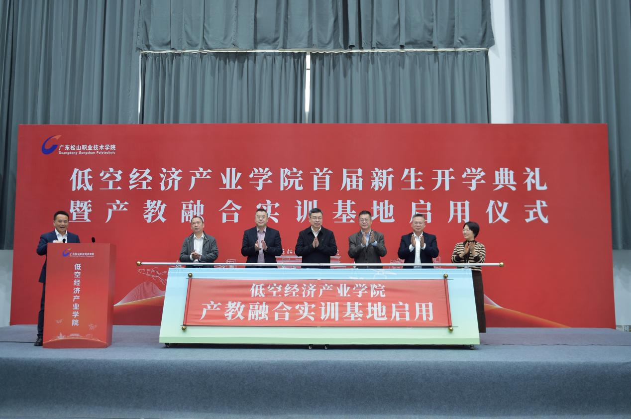 10月24日下午,广东松山职业技术学院低空经济产业学院首届新生开学典礼暨产教融合实训基地启用仪式在莲花校区正式举行。韶关市委常委、常务副市长蒋红林,北京中联航投集团有限公司董事长李刚,学校党委书记方迎生出席并致辞,市教育局副局长刘文胜、市工业和信息化局四级调研员李志勇、市发展和改革局四级调研员陈伟洁,学校党委副书记洪明刚、副校长张志等领导及低空经济产业学院全体师生共同参与,一同见证了学校在深化产教融合、服务区域低空经济发展征程中的这一重要里程碑时刻。