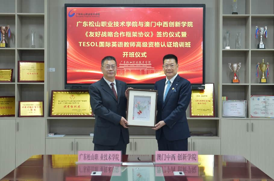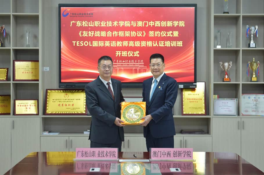 12月23日下午,广东松山职业技术学院与澳门中西创新学院《友好战略合作框架协议》签约仪式暨TESOL国际英语教师高级资格认证培训班开班仪式,在莲花校区顺利举行。澳门中西创新学院校长仲伟合、学校党委书记方迎生出席活动,副校长张志主持仪式,澳门中西创新学院办公室主任魏球、学校相关单位负责人及参培教师共同见证这一重要时刻。