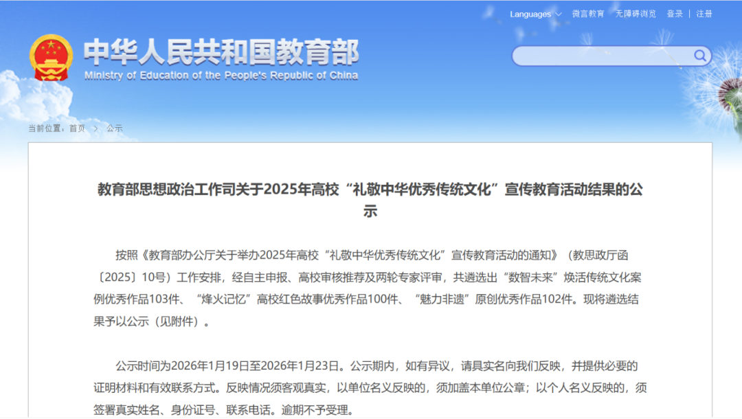 据悉,“礼敬中华优秀传统文化”宣传教育活动由教育部主办,自2014年起已持续开展十余年,是推动高校文化育人、深化校园文化建设的重要载体。本次活动经自主申报、高校审核推荐及两轮专家评审,共遴选出“数智未来”焕活传统文化案例优秀作品103件、“烽火记忆”高校红色故事优秀作品100件、“魅力非遗”原创优秀作品102件。