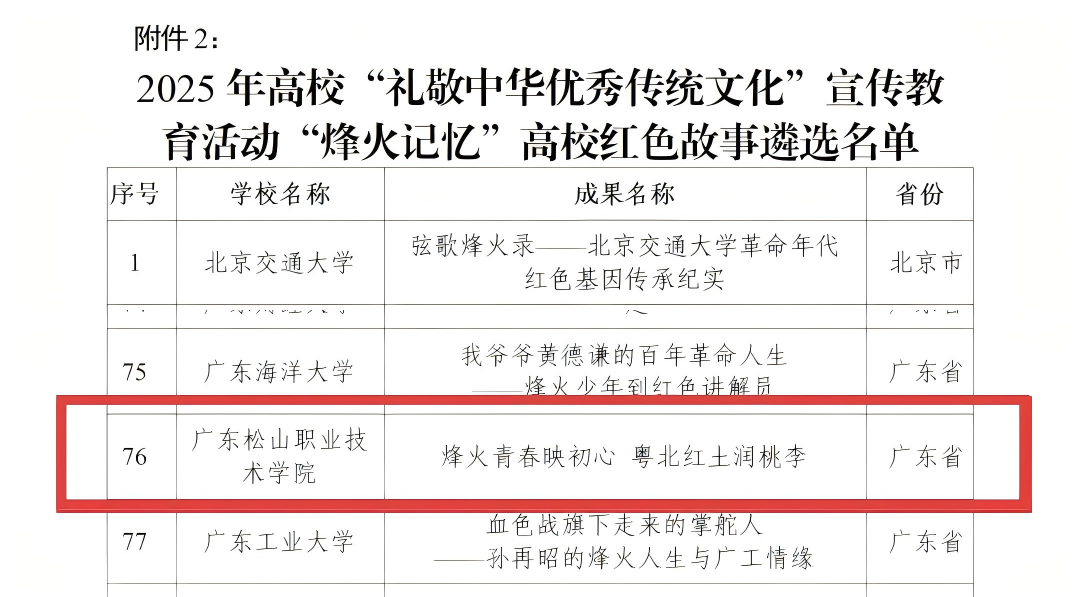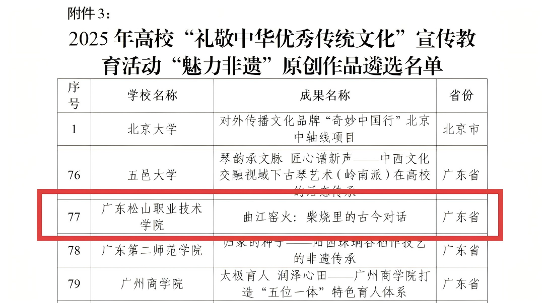 近日,教育部2025年度高校“礼敬中华优秀传统文化”宣传教育活动评选结果揭晓,广东省共有24件作品入选,我校报送的3件作品中有2件成功入选公示名单,获评数量居全省高职院校第一。其中,《烽火青春映初心 粤北红土润桃李》入选“烽火记忆”高校红色故事遴选名单,《曲江窑火:柴烧里的古今对话》入选“魅力非遗”原创作品遴选名单。此次两件作品同时入选,充分彰显了我校在挖掘地方文化资源、传承弘扬中华优秀传统文化方面的显著成效与深厚底蕴。