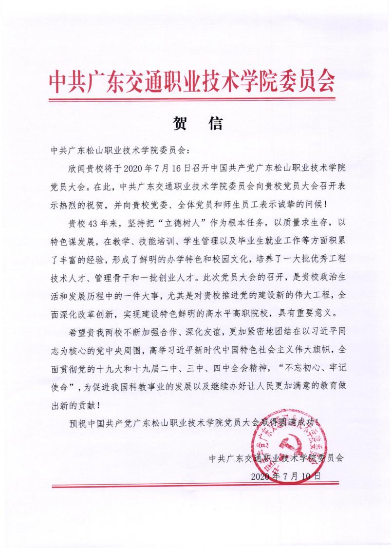 广东交通职业技术学院贺信