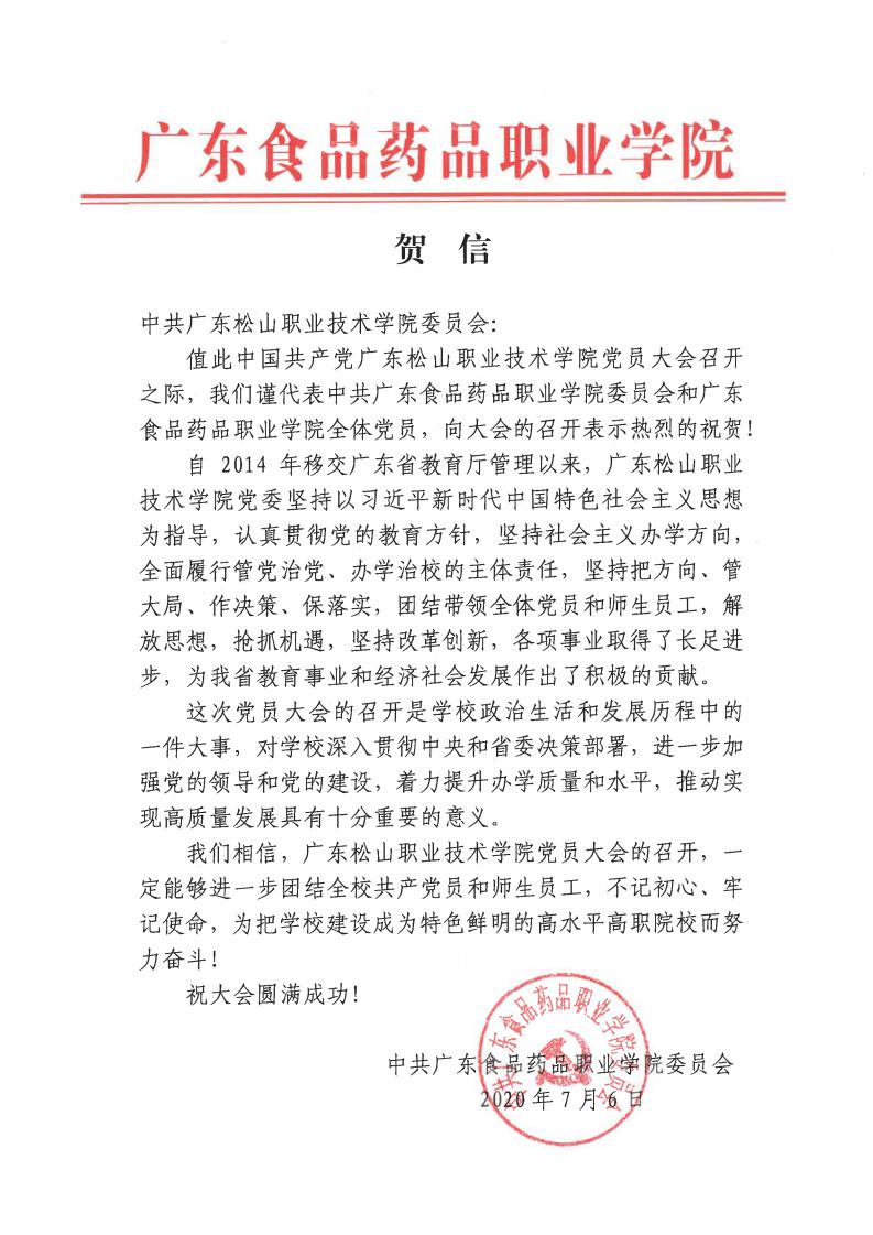 广东食品药品职业学院贺信