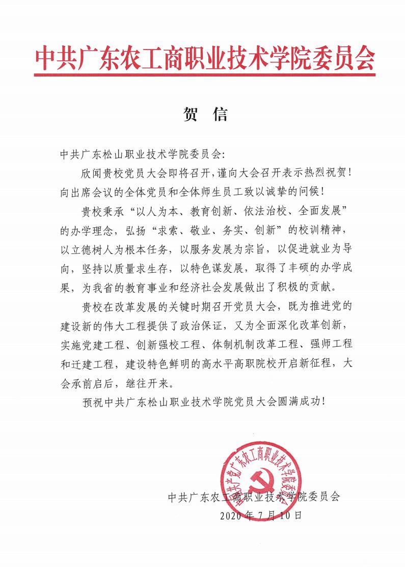 广东农工商职业技术学院贺信