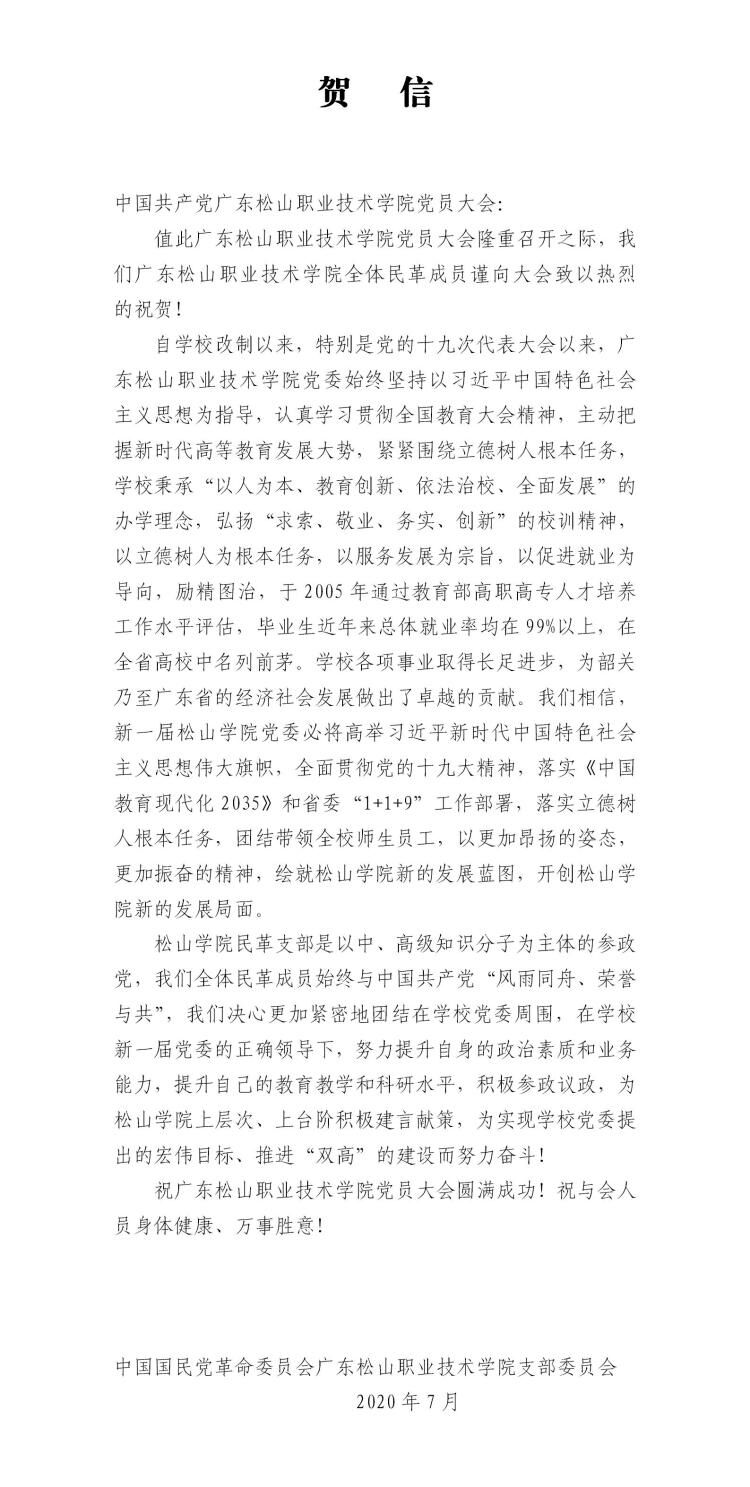 中国国民党革命委员会广东松山职业技术学院支部委员会贺信