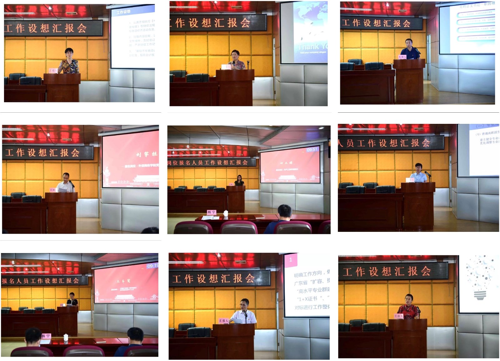 会上,朱艳、赵华、赵保宁、刘攀桂、田亚娟、魏志丽、王玉贤、尹渔清和范卉敏等9位汇报人分别围绕个人意向岗位阐述了自己的工作设想、工作思路以及相关举措,表达了愿为学校全面深化改革和实现各项事业高质量发展贡献智慧和力量的积极意愿。方迎生、谭春雨、杨宇、佘少华分别向汇报人就学校财务管理、教学质量监测体系的建构、党建工作创新、全面从严治党、团队建设、产业学院和高水平专业群建设、如何平衡个人专业发展和二级学院发展的关系等方面进行了提问,汇报人一一进行了回答。