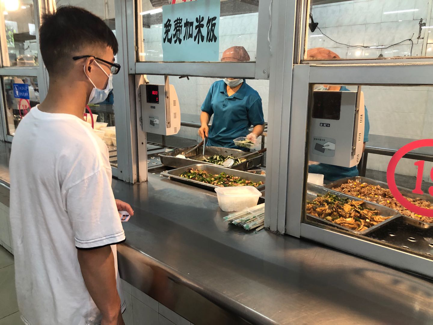 午餐时分,从一食堂飘出饭菜的香味仿佛也在欢迎同学们的归来,一盆盆经过厨师烹制色味俱全的炒菜分别摆放在干净卫生的各个价格区域,同学们依照就餐指引进行测量体温、餐前洗手,在取餐窗口快速取餐离开不作聚集停留,往常熙熙攘攘的食堂变得安静有序。