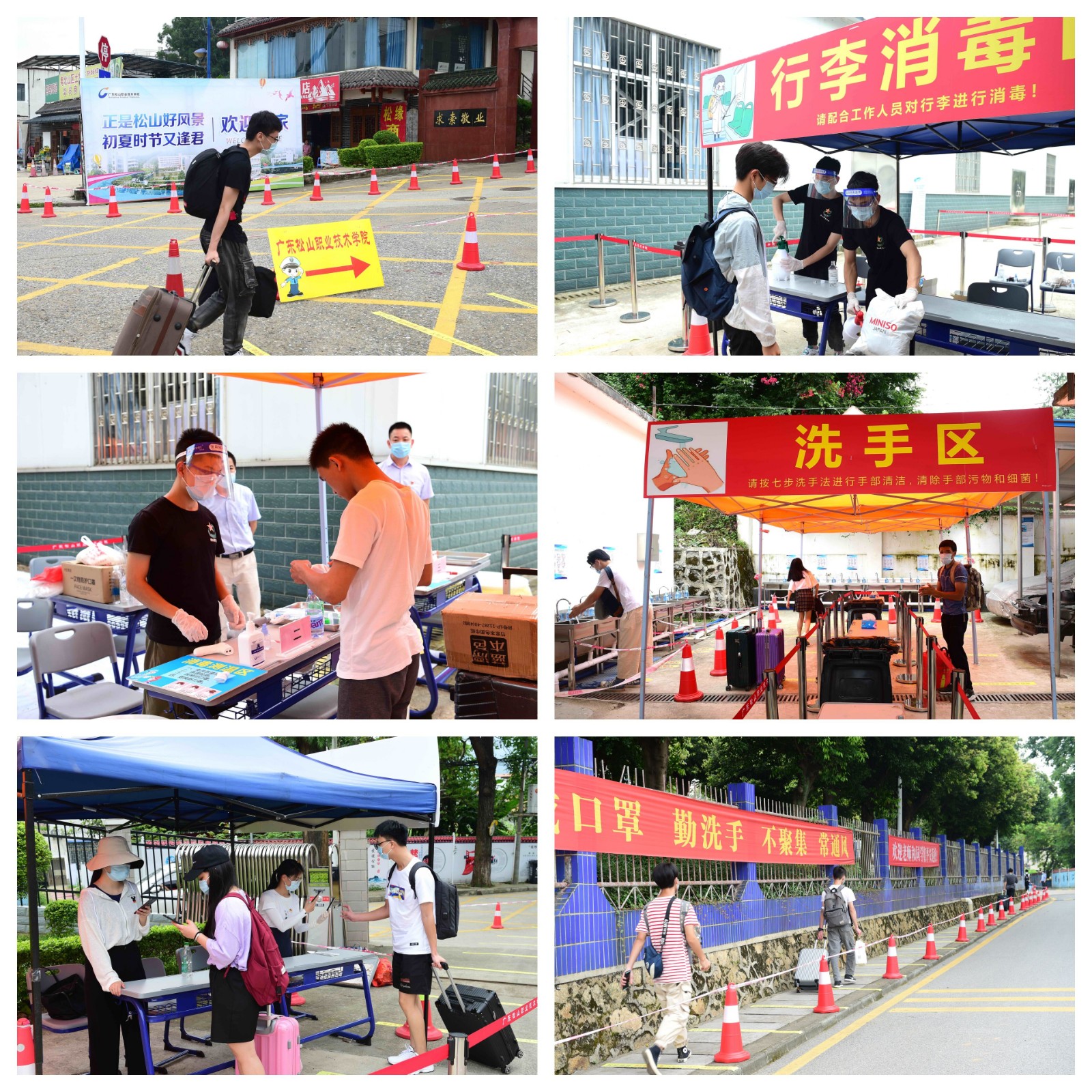 上午,首批平安返校的10多位同学均来自韶关地区,随后来自南雄、湛江等地的同学陆续乘车顺利抵达校门报到现场。只要有学生到达,即刻有校卫队员引导学生从进校通道进入,同学们佩戴口罩,间隔排队,在老师和学生组成的志愿者的指引下通过额温枪测体温,更换口罩,将行李带到指定区域消毒,进行14天粤康码扫码确认健康状况,最后到宿舍入口处再次测温,体温正常学生即可入住宿舍,完成返校报到所有流程。