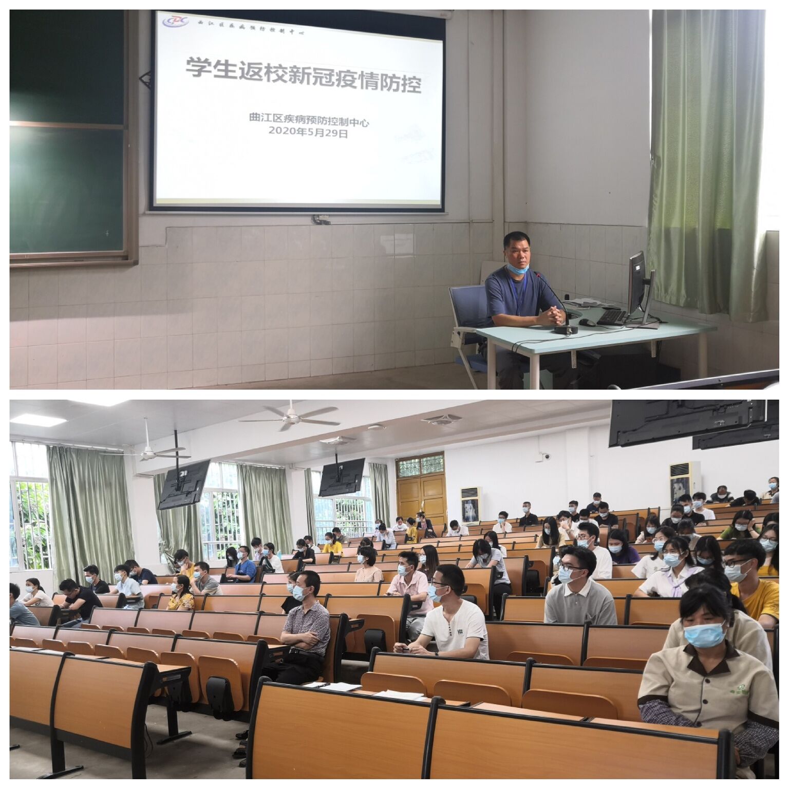 在宽C201,曲江区疾病预防控制中心副主任朱会和分别从学生返校后的新冠疫情防控和如何做好清洁消毒两个专题进行讲解。他从新冠肺炎的概述入手,就如何健全校园疫情防控体系、做好人员和场所的管理、以及做好个人日常卫生,如何在传染病流行期间清洁消毒等都做了细致和深入浅出的讲解。