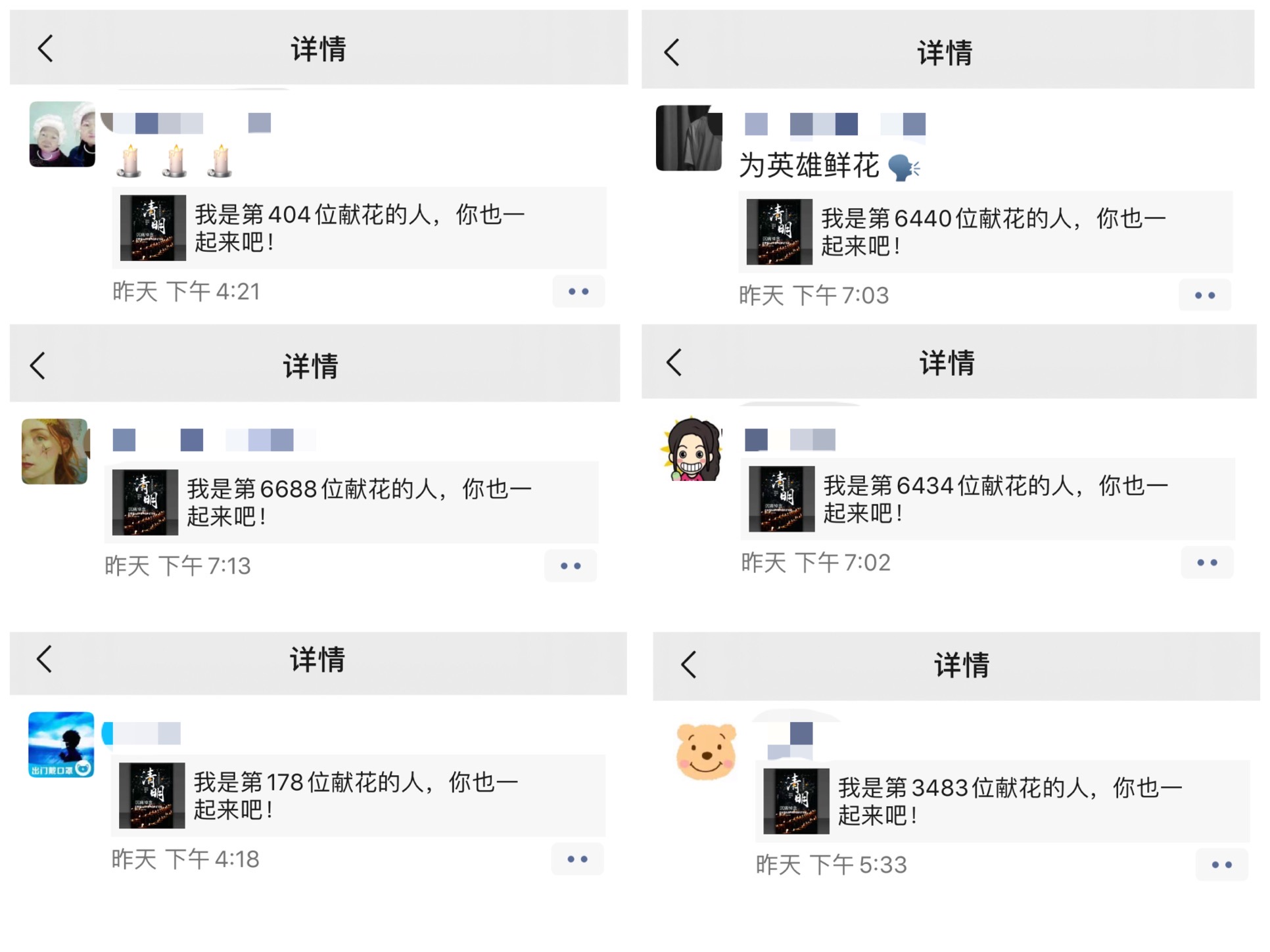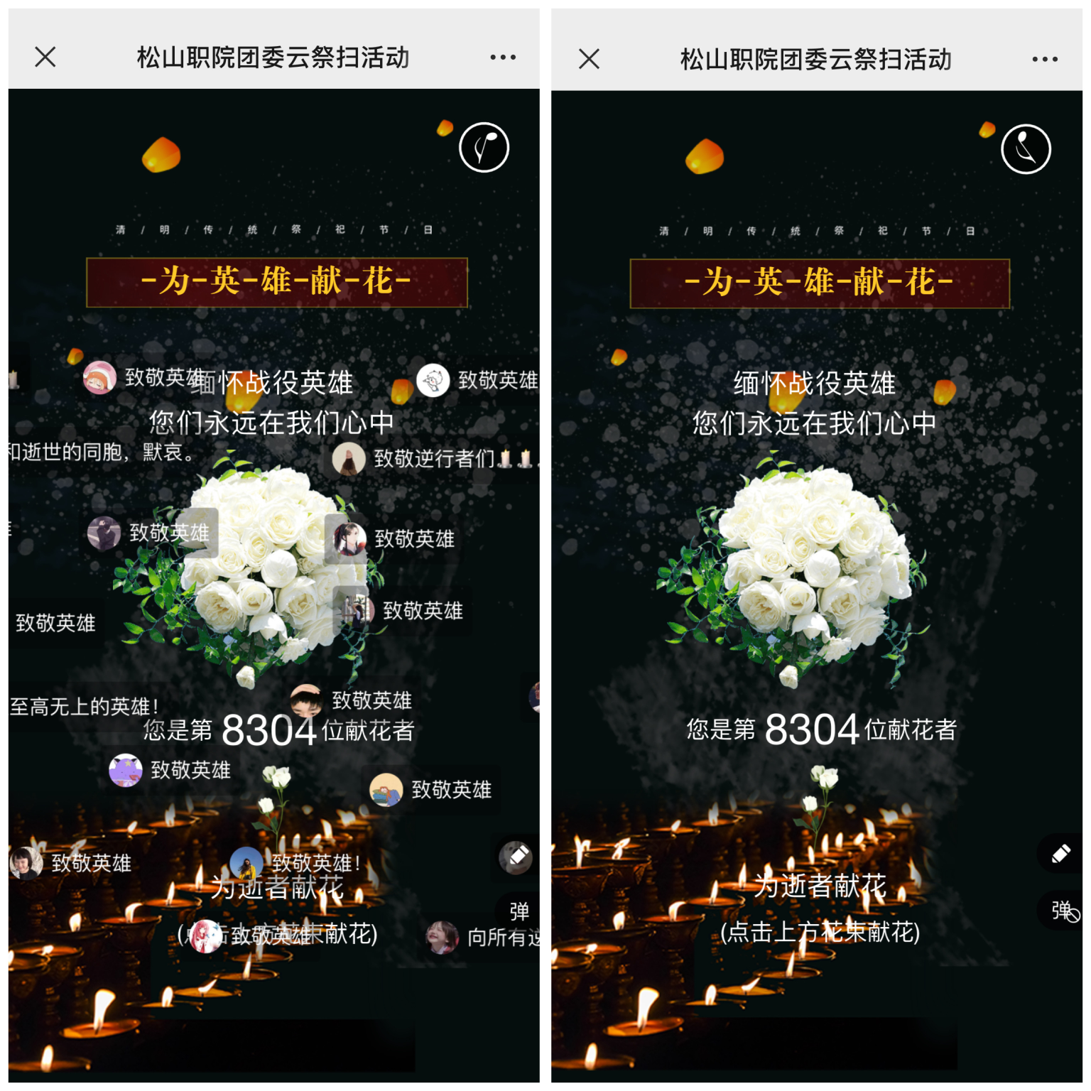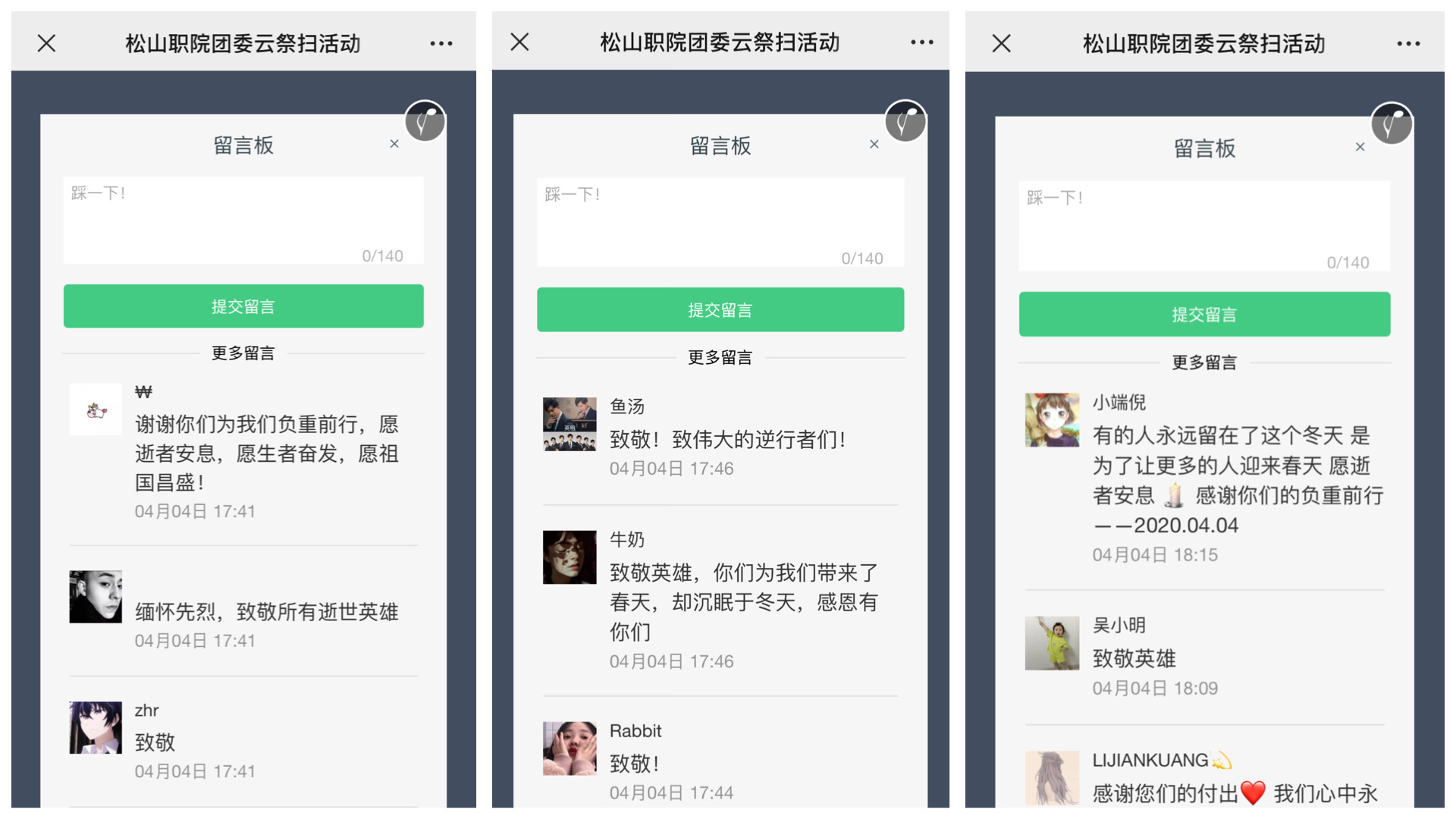 我院团员青年通过学院团委微信公众平台在线悼念烈士、同胞。在云祭扫平台上,一张张英烈遗照、一幕幕战“疫”场景,让参与者回顾了这场战“疫”的点点滴滴,深深缅怀牺牲在战“疫”一线的“战士”们,并向抗“疫”英烈在线献花,发表祭奠感言。