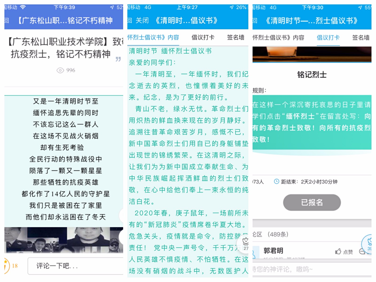 当天,学院组织广大党员通过微信参加省委组织部推出“清明节,让我们向英雄致敬”活动,共同缅怀疫情防控一线因公殉职党员、干部,向英雄致敬。学院团委组织团员青年开展“清明祭英魂”线上云祭扫活动,向牺牲英雄献花致哀,截止至4月4日24时,共有8304人参与活动。学院易班工作室推出了“致敬抗疫烈士 铭记不朽精神”网络软文和“清明缅怀烈士倡议书”轻应用打卡活动,1073名学生干部和骨干成员参与活动,489人在评论区发帖缅怀烈士。