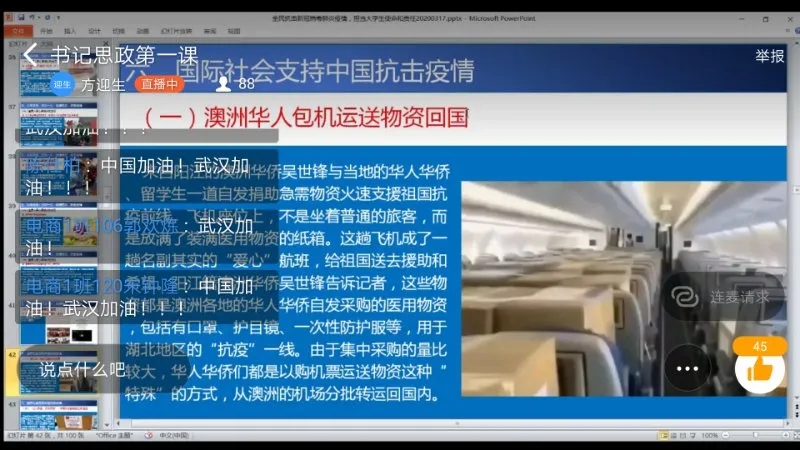 方书记从新型冠状病毒肺炎疫情的发生、危害;国家启动一级应急响应机制全面抗击新型冠状病毒肺炎疫情;联合国、世界卫生组织等支持中国抗击疫情等十个方面,通过一组组详实的数据、一幅幅感人的画面、一件件感人的事迹、一个个感动的人物,全面回顾了党中央的战“疫”部署,讲述了全国上下同心战“疫”的感人故事,与青年学生分享了防疫知识和基本方法,号召大学生面对疫情,要担负起时代使命和责任。他强调,疫情的出现使我们改变了许多,就如眼前学习方式的改变,但是不变的是对知识的渴望,对真理的求解和对祖国的热爱。