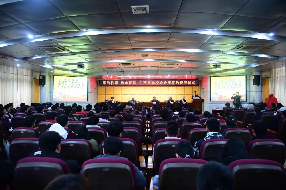 随后,学院、华为机器、中南国际三方领导签署校企合作框架协议并共同为“校企合作人才培养基地”牌匾揭牌。