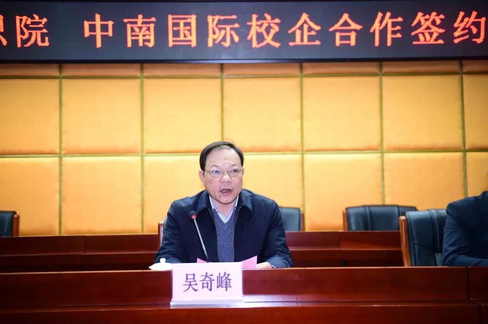 学院院长吴奇峰在校企合作签约授牌仪式上致辞,他高度肯定民族品牌企业华为机器有限公司和国内知名品牌中南人力资源集团的骄人业绩和未来发展前景,表示能与华为机器、中南国际进行深度合作,是对我院办学成绩、办学水平的充分信赖,也是对以往的友好合作的肯定和总结。今后学院将以企业的需求为动力,坚持开放办学,坚定不移地走产、学、研一体化道路,在与企业的深度合作中实现优势互补、资源共享,从而进一步增强学校发展的后劲和活力。