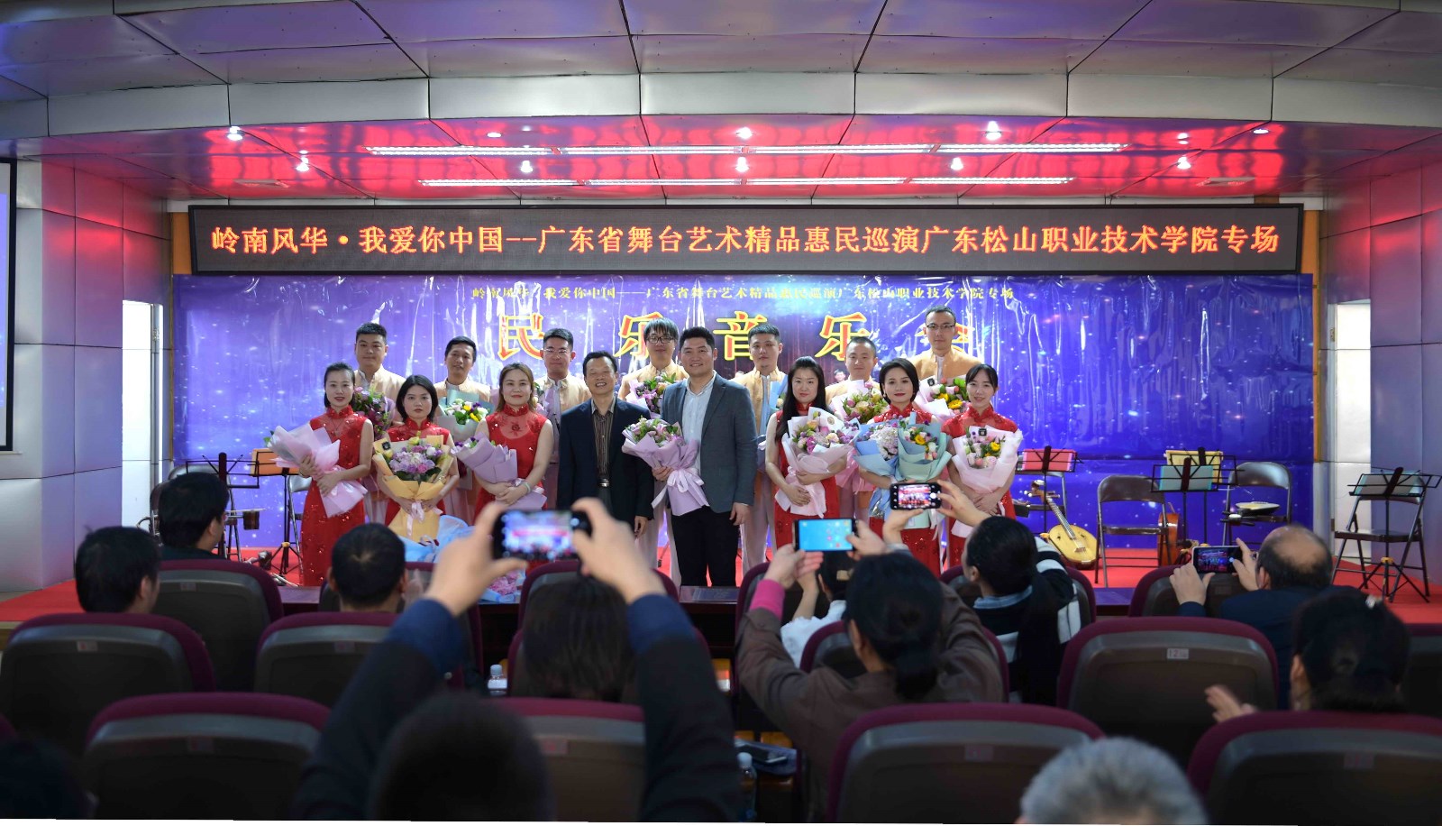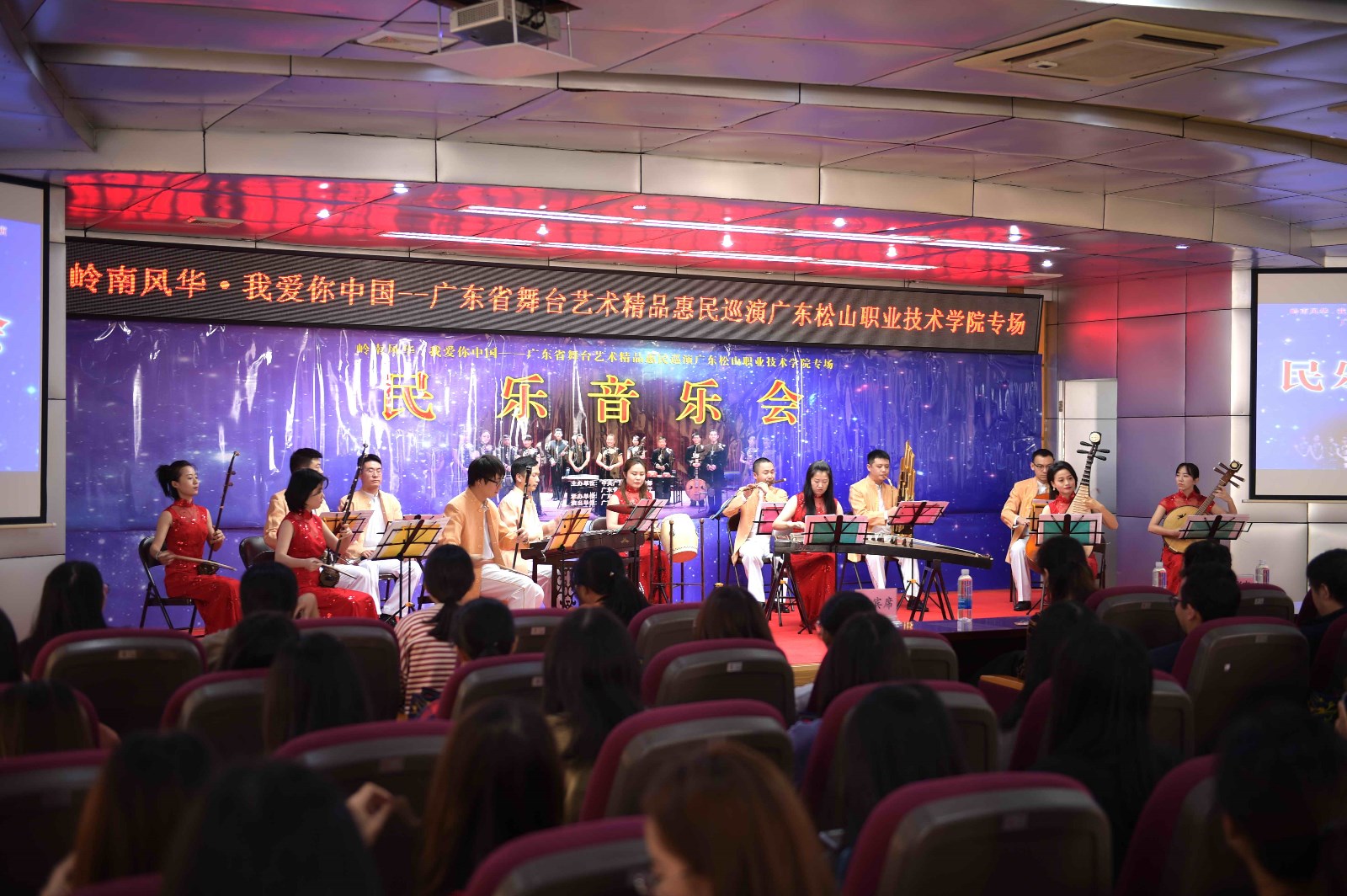 11月12日下午,广东松山职业技术学院内宽字楼二楼学术报告厅悄然改变画风,一曲曲活泼欢快、优美流畅的民族高雅音乐从这里流淌出来,吸引了师生们纷纷到此驻足观看,充分享受了一场精彩纷呈的民族器乐演出。这是我院在深入推进“不忘初心、牢记使命”主题教育中,落实为民办实事的举措,引进高雅艺术进校园,并进一步推进文明校园创建工作,特邀“岭南风华·我爱你中国——广东省舞台艺术精品惠民巡演”走进松山校园,为广大师生带来一次精彩的艺术享受。