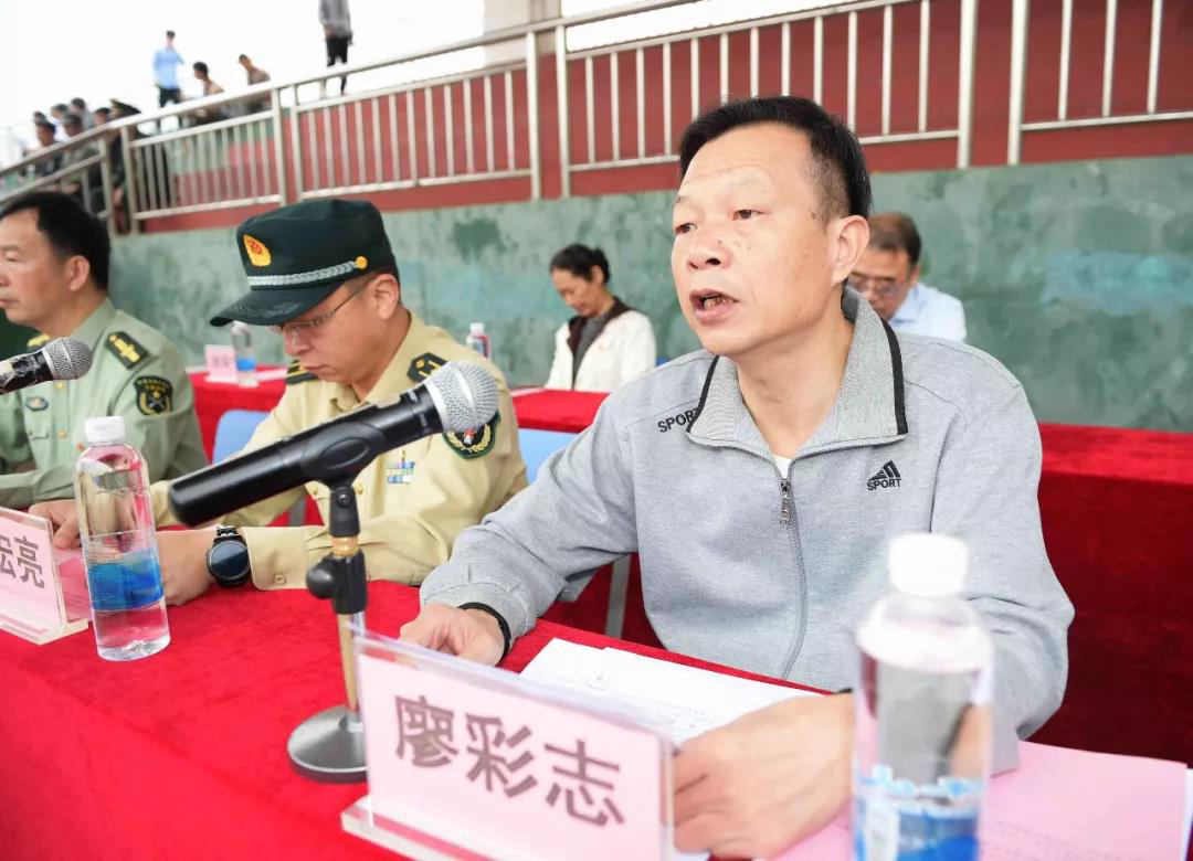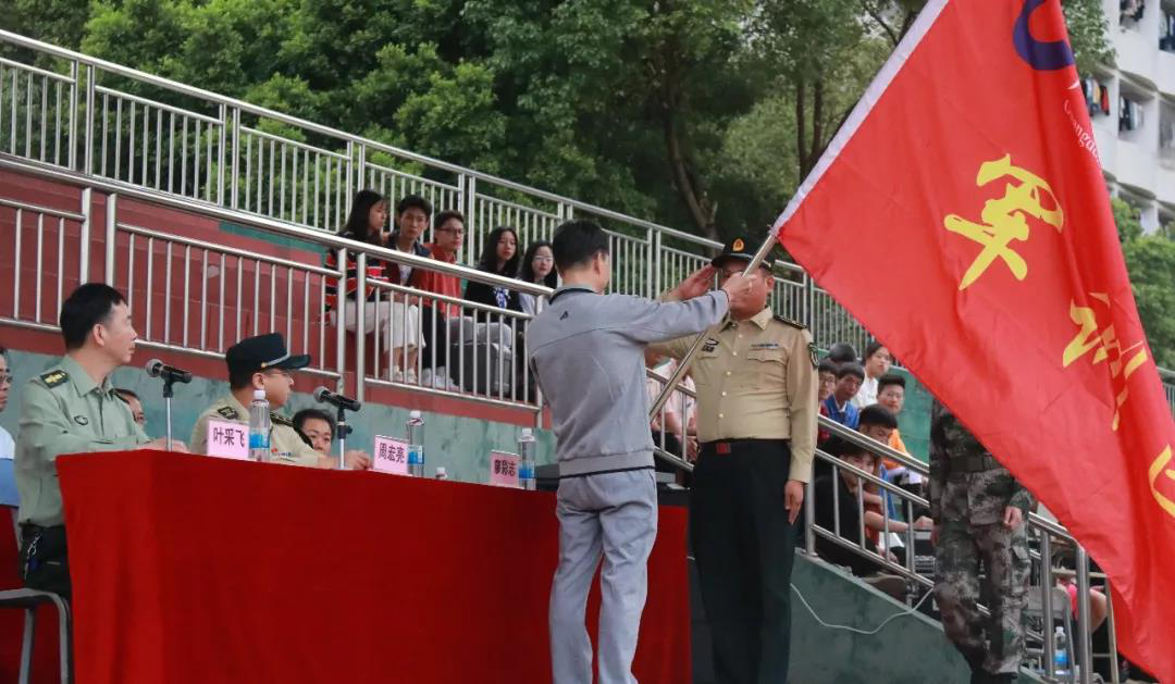 廖副院长代表学院向广东松山职业技术学院2019级军训团团长授旗,授旗后,军训团团长宣布,广东松山职业技术学院2019级新生军训正式开始。