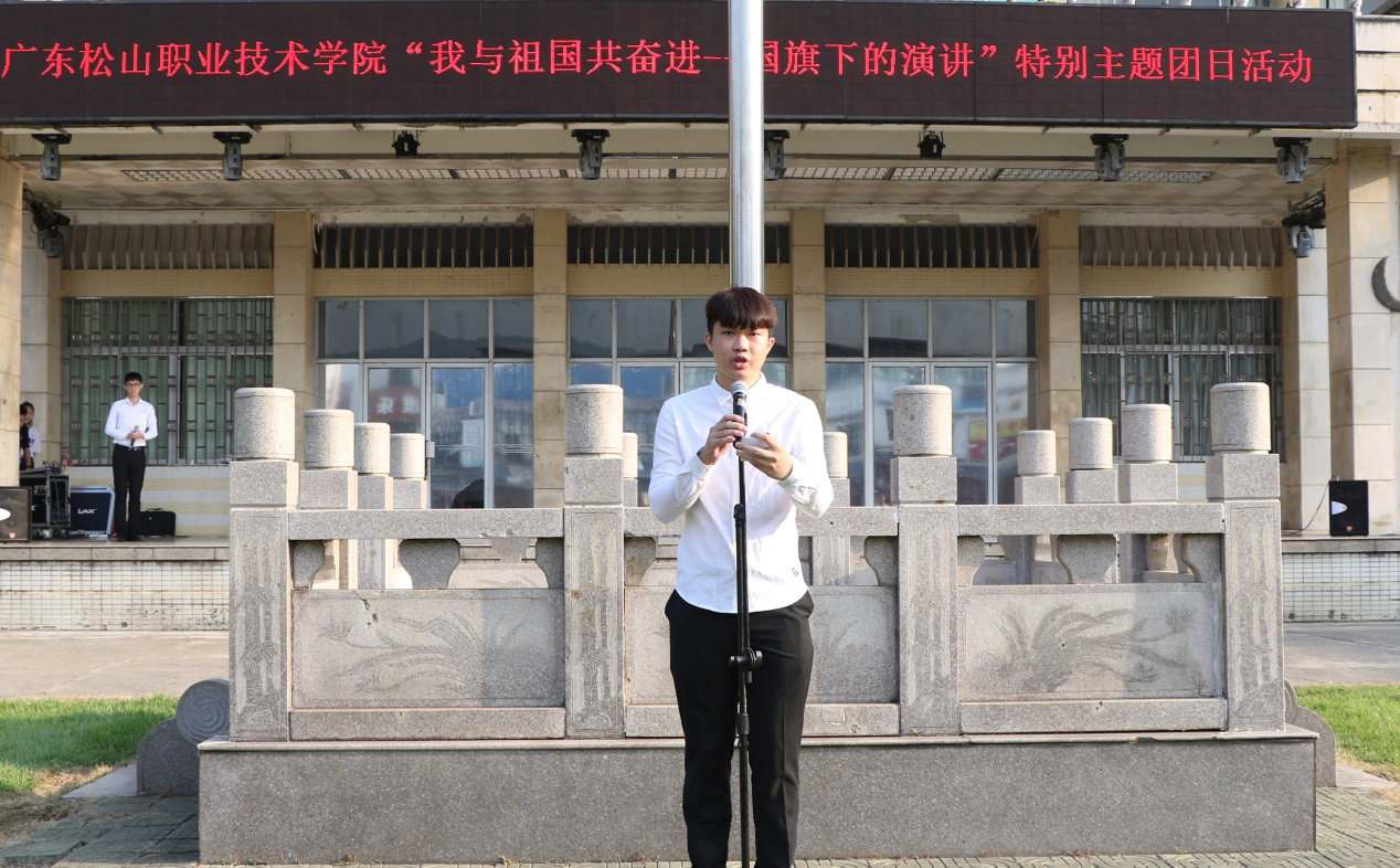 升旗仪式后,优秀学生代表孔繁华同学以“我与祖国共奋进”为主题发表国旗下的演讲。他围绕学习贯彻习近平总书记在纪念五四运动100周年大会上的重要讲话精神,结合个人学习经历,勉励同学们要珍惜当下,勤奋学习,砥砺奋斗,要扛起我们身上的责任,为祖国的继续发展、为中华民族伟大复兴的中国梦奉献出我们的一份力量。