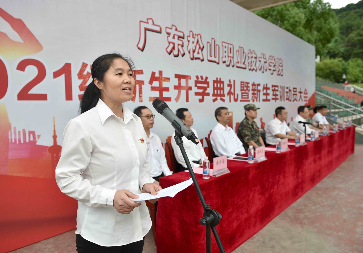 “广东省三八红旗手”“南粤优秀教师”获得者,机械工程学院教师曹智梅代表全校老师为2021级新同学送上了美好祝福。她指出,大学是梦想启航的地方,松山学院有着45年的办学历史,培养了全国劳模、全国技术能手等一大批能工巧匠,感谢同学们选择松山,松山也一定不会辜负同学们的信任。作为一名扎根松山22年的老教师,曹智梅深情寄语新同学,在未来的大学生活中能够以进取的心态,尽快适应新环境,学会学习、学会生活、学会做人!
