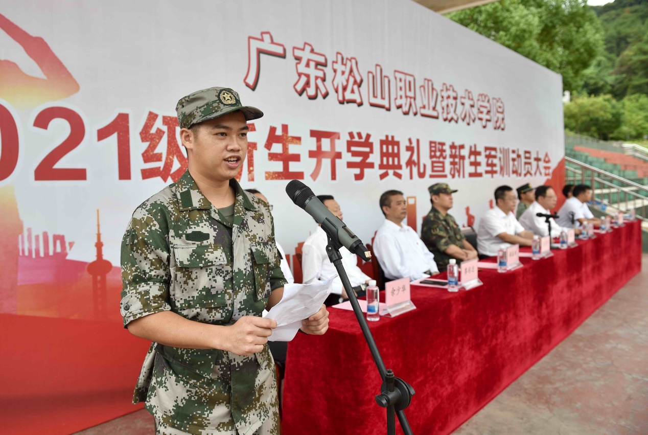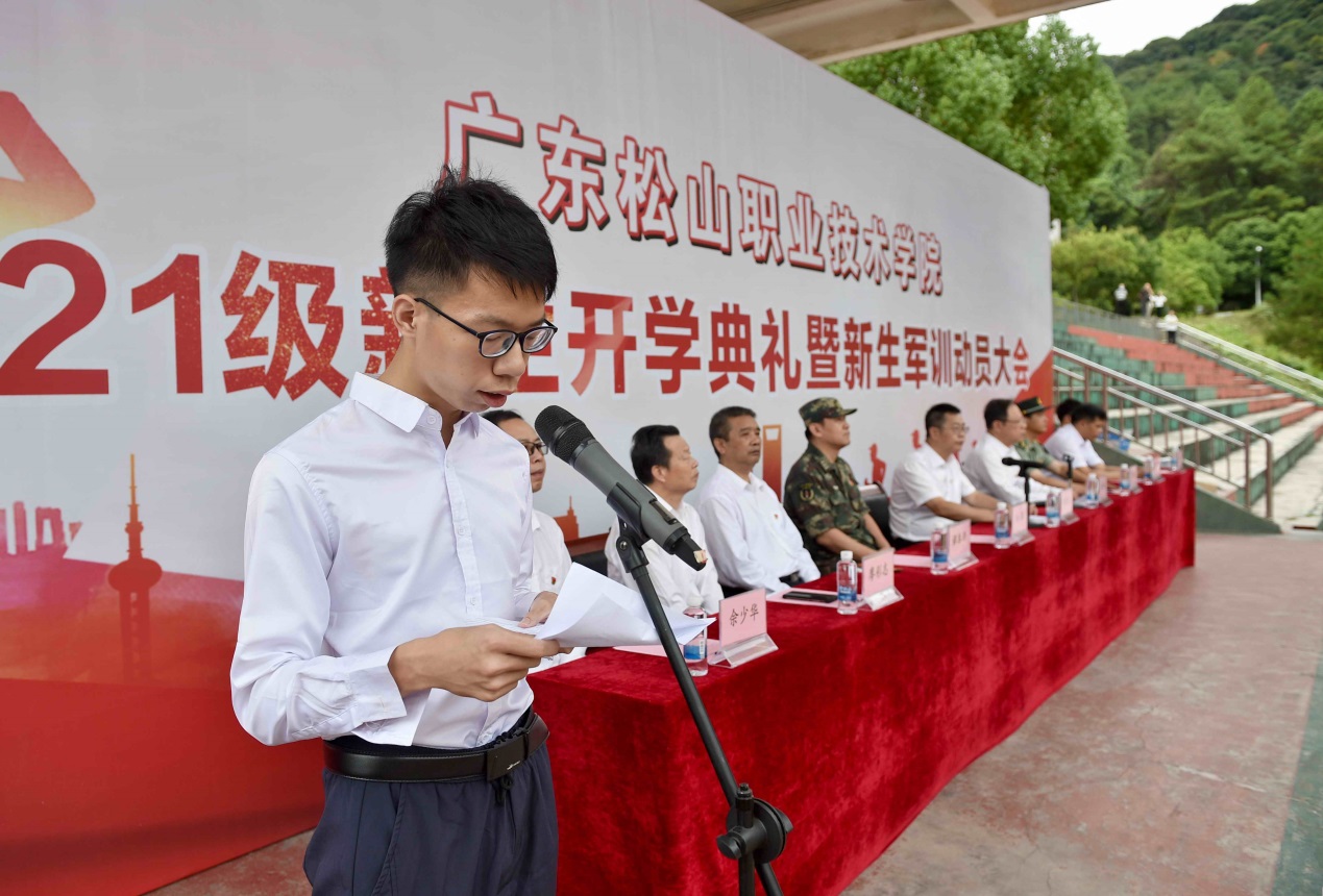 新生代表、计算机与信息工程学院2021级软件专业学生陈梓锋代表新生向领导老师致谢,并表示站在人生新的起点,在未来三年的松山学习生活中,要严格要求自己,志存高远、树立明确目标,勿忘初心、砥砺前行,踏实做人、努力学习,不辜负父母和老师的期望,用个人奋斗点缀复兴大业不负时代重托,争做有为青年!