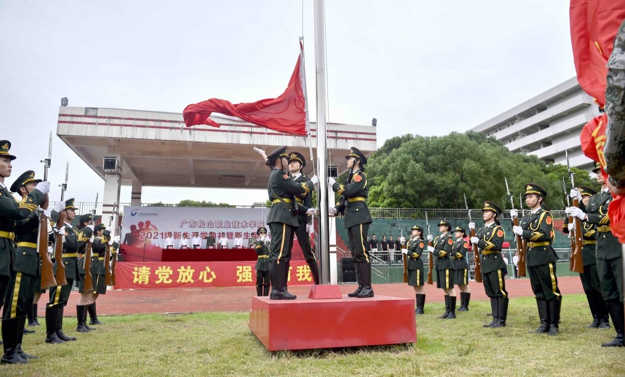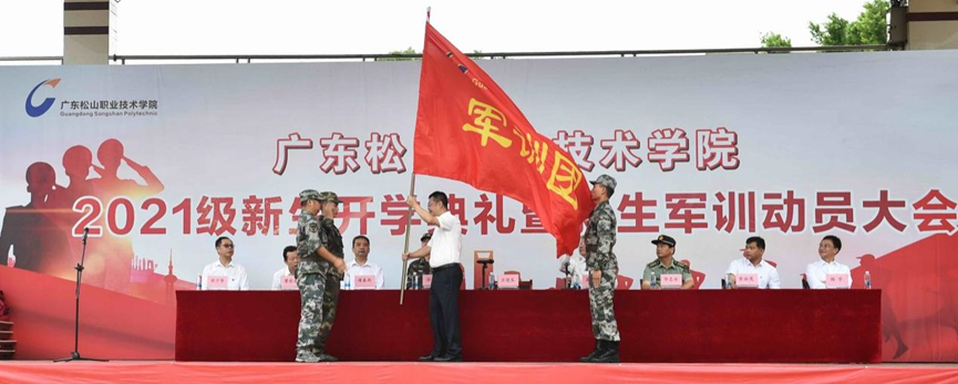 动员会上还举行了授旗仪式。方迎生代表学校向广东松山职业技术学院2021级军训团授予军训团团旗。至此,我校2021级军训正式拉开帷幕。