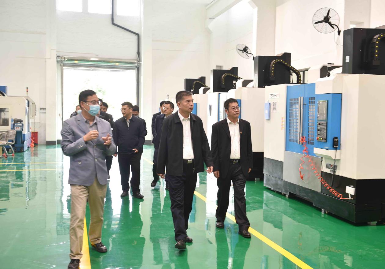 图:学校领导班子陪同省厅领导一行参观数控车间实训室