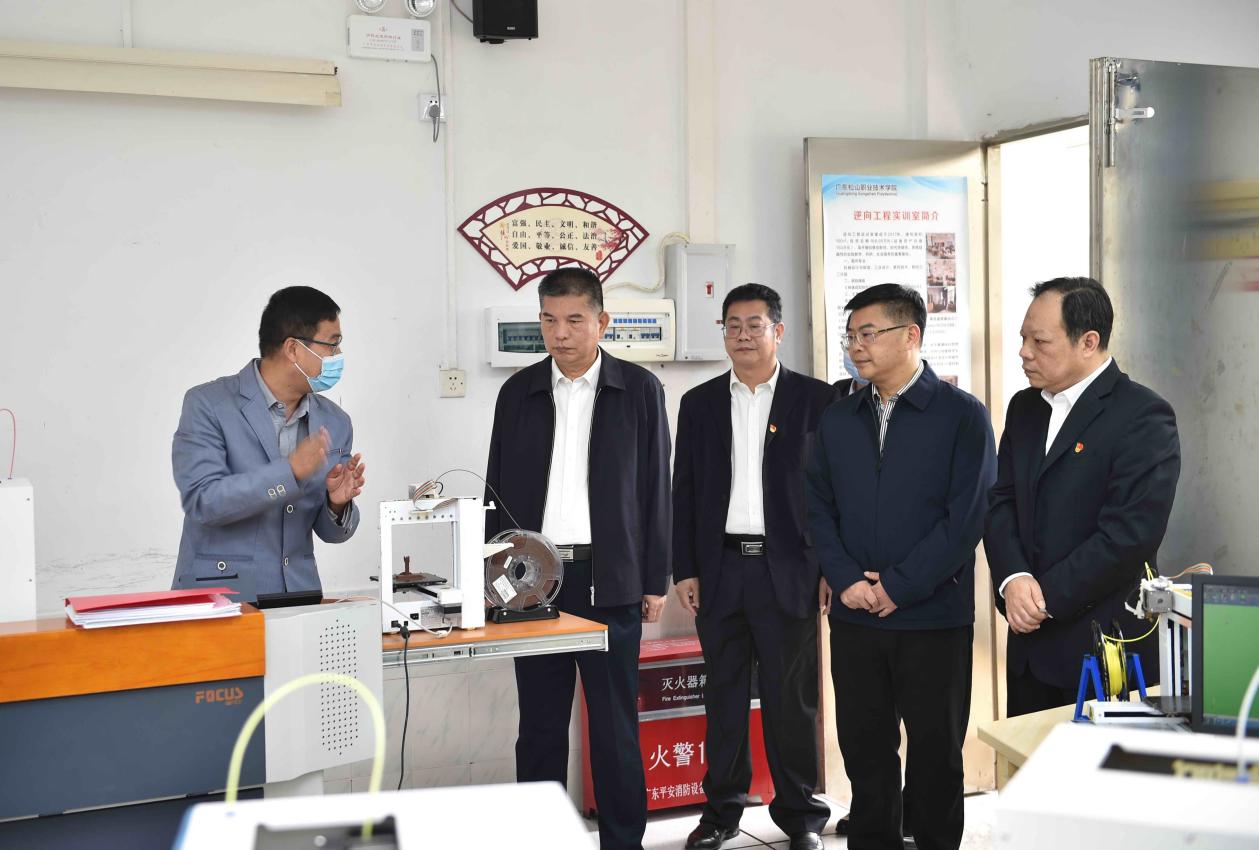 图:学校领导班子陪同省厅领导一行参观3D创客工作室