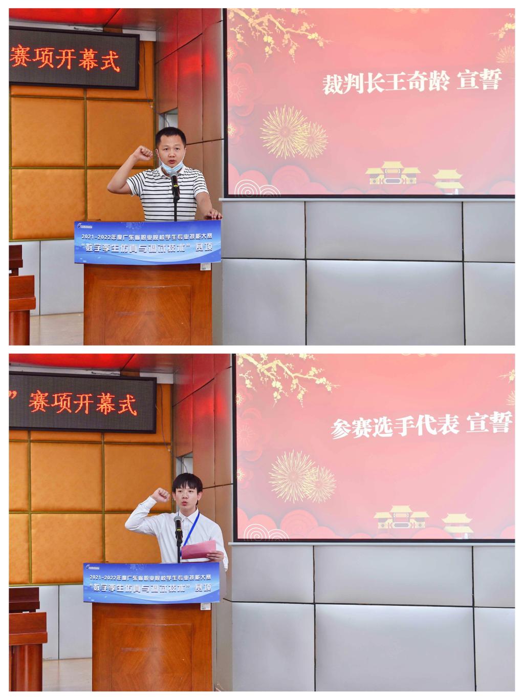 会上,大赛督察员陆璃抽取竞赛试题,大赛裁判组组长王奇龄代表全体裁判宣誓,张盛茂代表全体参赛选手宣誓。
