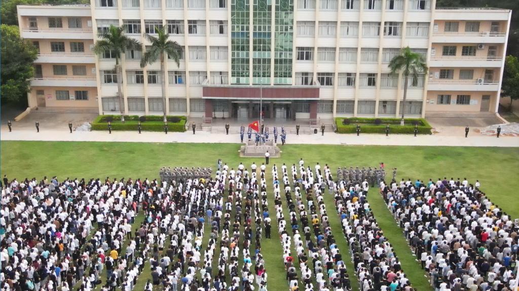 升旗仪式开始,学校国旗护卫队迈着坚定有力的步伐,整齐划一、昂首挺胸地走向升旗台。“起来,不愿做奴隶的人们,把我们的血肉筑成我们新的长城……”,在全体师生齐唱的嘹亮国歌声中,升旗手振臂一挥,将鲜艳的五星红旗抛向空中,五星红旗在数千名师生的注目礼中冉冉升起。