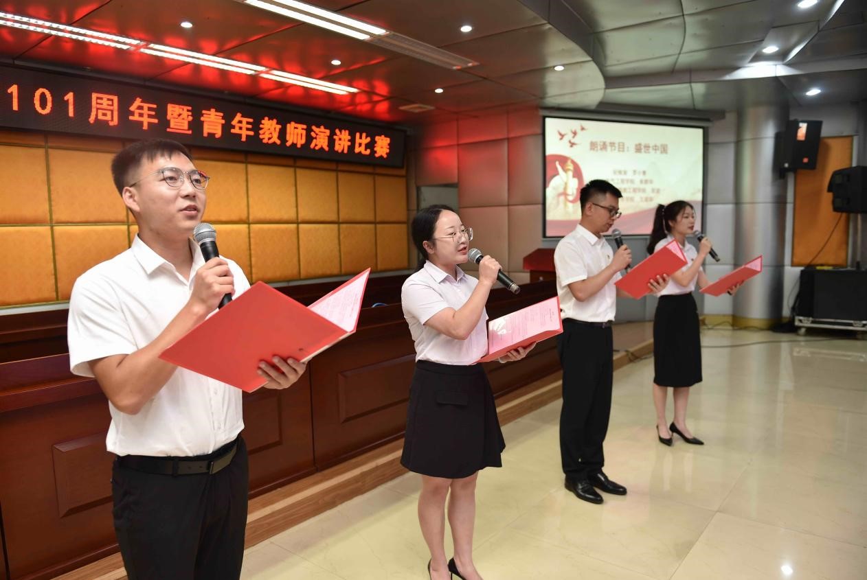 演讲环节结束后,4位青年教师代表为现场师生带来了《盛世中国》的朗诵节目,他们声情并茂、抑扬顿挫的朗诵,让现场的观众感受到了朗朗乾坤,堂堂中华的盛世景象,也深情地抒发着对伟大祖国的无限赞美,坚定了从胜利走向新的胜利,从辉煌走向新的辉煌的无限信心和决心。