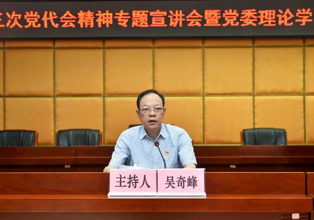 7月6日下午,学校党委在学术报告厅二楼组织召开了省第十三次党代会精神专题宣讲会暨党委理论学习中心组学习(扩大)会议,专题学习贯彻广东省第十三次党代会精神。学校党委副书记、校长吴奇峰主持会议并讲话。在家校领导全部出席宣讲会,学校科级及以上干部,马克思主义学院教师,各级党支部书记、组织员,党员教师代表等180余人参加会议。