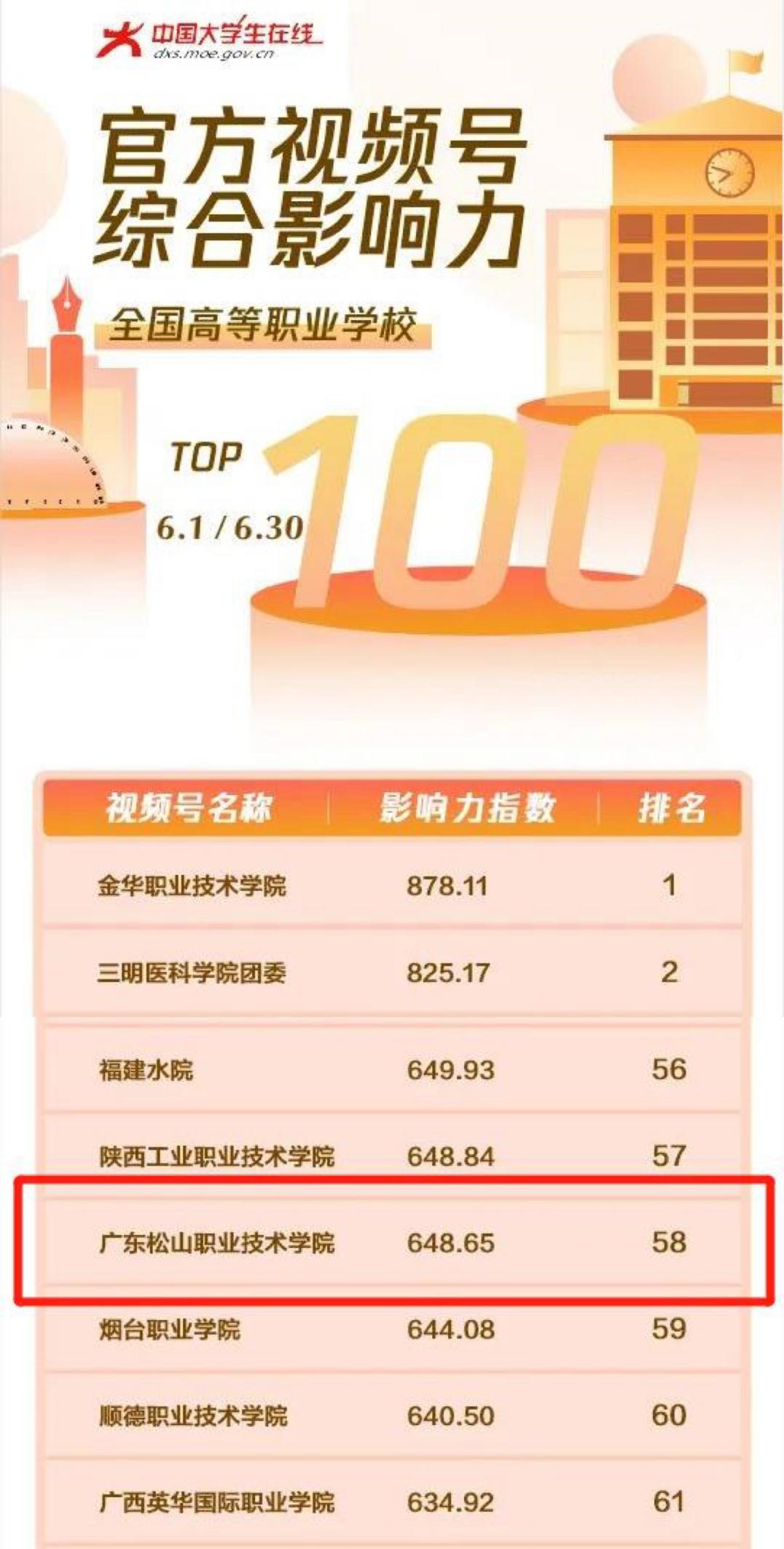 7月22日,教育部中国大学生在线公布了“2022年6月全国高校(本科院校/职业院校)视频号综合影响力榜单”,我校“广东松山职业技术学院”官方视频号在全国高等职业院校中排名第58位,这是我校首次荣登全国高职院校官方视频号综合影响力百强榜,学校网络影响力不断攀升。