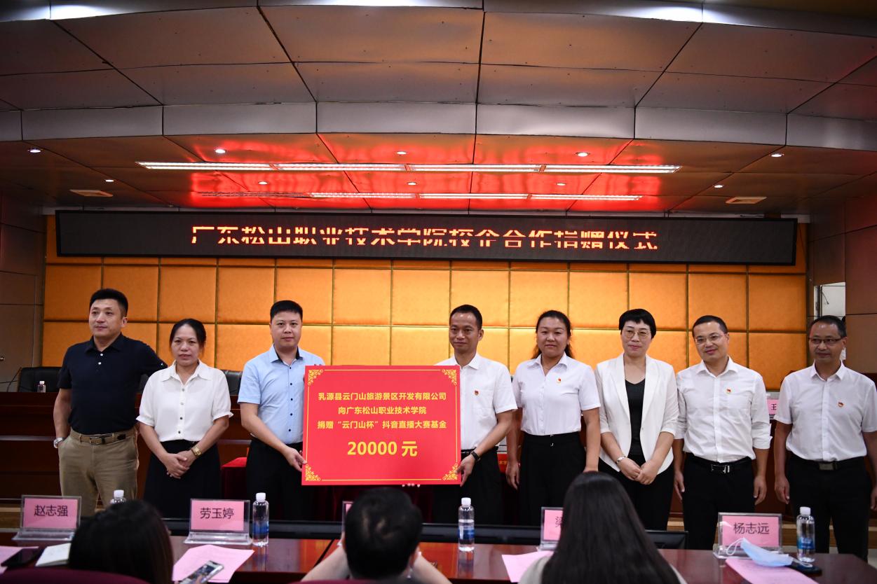 接着,会议举行捐赠仪式,由乳源县云门山旅游景区开发有限公司和广东三合电子实业有限公司分别向学校捐赠“云门山杯”抖音直播大赛基金2万元以及价值8万5千元直播间。王玉贤和外语商务学院副院长高恒冠代表学校与捐赠企业代表签订捐赠协议并合影留念。