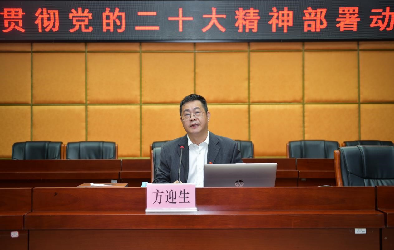 11月3日上午,我校在学术报告厅二楼宽C201召开全校学习宣传贯彻党的二十大精神部署动员会,学校党委书记方迎生主持会议并作部署动员,校领导吴奇峰、谭春雨、张林茂、杨宇、张志、佘少华出席会议,中层干部、思政课教师、辅导员共计100余人参加会议。