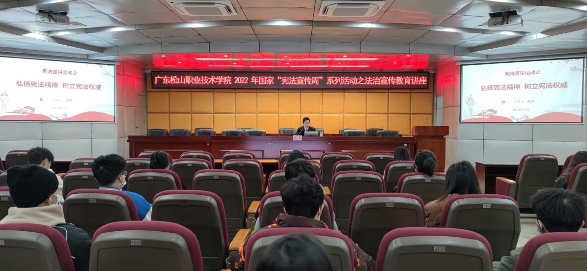在第五个“宪法宣传周”到来之际,广东松山职业技术学院围绕“学习宣传贯彻党的二十大精神,自觉维护宪法权威”主题,通过“主场活动+专题活动+主题日”的方式组织开展了“宪法宣传周”系列活动。
