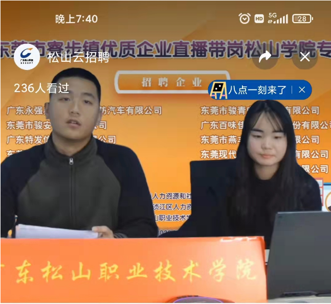 12月7日晚19:00-20:30,由东莞市人力资源和社会保障局寮步分局、韶关市浈江区人力资源和社会保障局主办我校承办的云招聘团队首播成功。本次直播主题为 “东莞市寮步镇优质企业直播带岗松山学院专场”活动,参加带岗企业10家,主要来自东莞寮步镇辖区。活动过程中有300余位意向毕业生参与,踊跃互动、咨询,企业HR现场解答,气氛良好。截至活动结束,各企业共收到毕业生求职简历150多份,活动效果受到学校、相关人社部门、企业的充分肯定。
