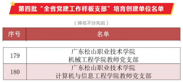 近日,省委教育工委公布了第四批全省党建工作示范高校、标杆院系、样板支部培育创建单位名单,遴选产生第四批全省党建双创工作培育创建单位,广东松山职业技术学院机械工程学院教师党支部和计算机与信息工程学院教师党支部入选全省党建工作样板支部培育创建单位。