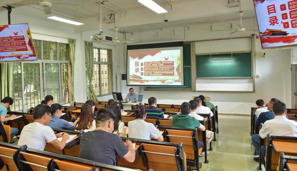 根据我校学习贯彻习近平新时代中国特色社会主义思想主题教育实施方案,在安排一周集中开展读书班学习研讨的基础上,5月4日下午,我校举办了主题教育学习讲堂第一期学习。党委委员、组织宣传统战部部长洪明刚以《坚持以党的二十大精神为统领 奋力推动学校主题教育走深走实》为题讲专题党课,组织宣传统战部党支部、学生工作部党支部、公共课教学部党支部、主题教育领导小组办公室党员等参加本期学习讲堂学习。