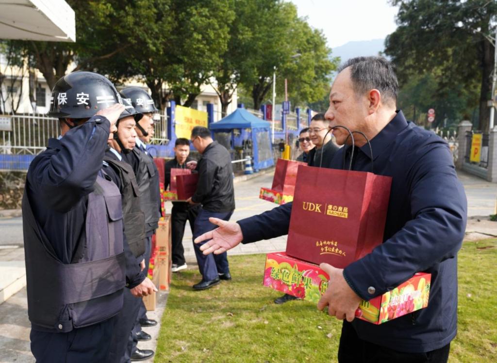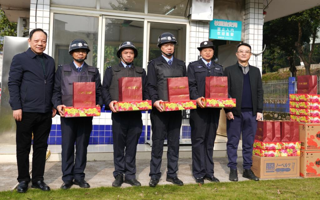 在曲江校区第一门岗,校卫队员着装整齐、队容严整、精神饱满。“祝大家新年快乐、阖家幸福、身体健康、工作顺利、事事顺心、龙年大吉!”吴奇峰一行向坚守一线的工作人员送上新春祝福,对大家忠于职守、甘于奉献给予了充分肯定。