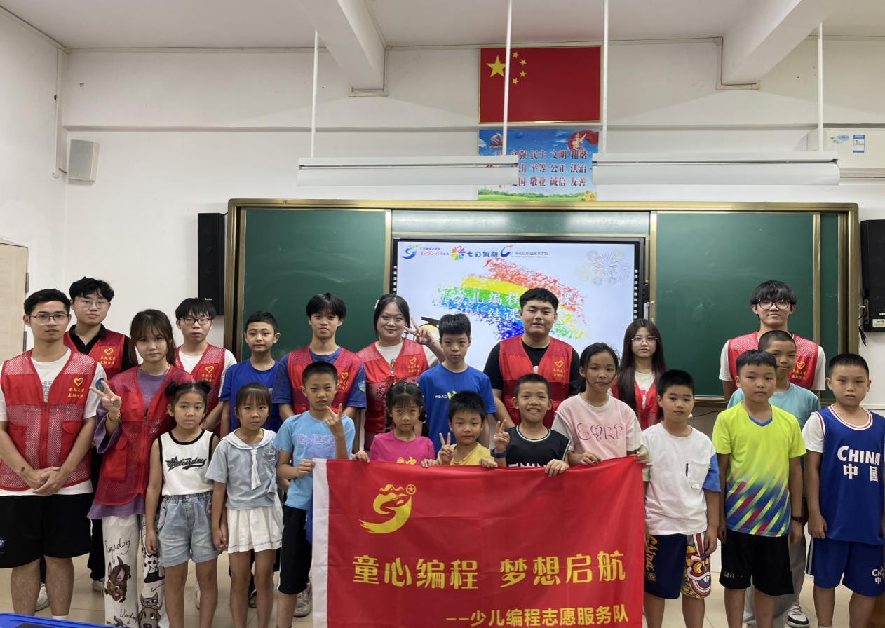 “童心编程,梦想启航”少儿编程志愿服务队集聚我校大数据专业群、粤北大数据产业学院和数创科教基地等优质资源,积极投身于粤北地区青少年科技教育普及与启蒙事业,在曲江、乐昌、武江等地开展90多场社会推广活动,本次在乐昌市青少年宫为两个班次30名青少年儿童开展了5天,共计10期的Scratch图形化编程以及机器人展示科普公益课,累计300人次听课。团队成员运用卡通人物、故事情节以及传统文化作为教学背景,采用多学科融合的创新教学方法,引导孩子们了解少儿编程基础知识,培养逻辑思维、创新和解决问题的能力,点燃了乡村孩子的科技梦想,更在乡村振兴的画卷上绘就智慧教育的绚烂篇章。