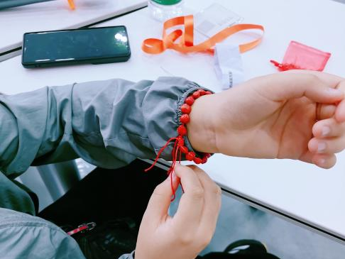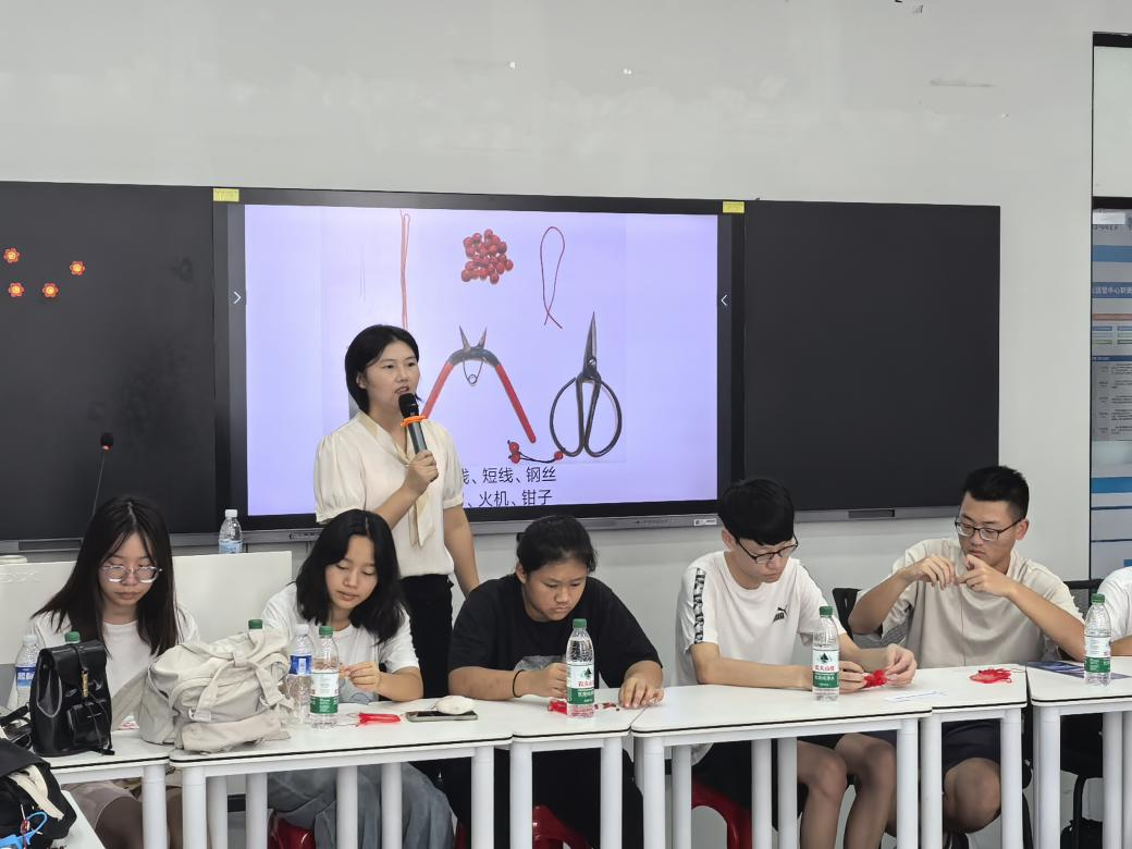 红豆绳制作是本部分的亮点之一,外语商务学院教师张亚慧向学生们展示了丹霞红豆绳成品,并详细介绍了制作材料和步骤。学生们在老师们的指导下,亲手体验了丹霞红豆绳的制作过程。通过挑选颜色、穿红豆、添加饰品等步骤,学生们不仅学会了制作红豆绳,还充分发挥了自己的创意与想象力。