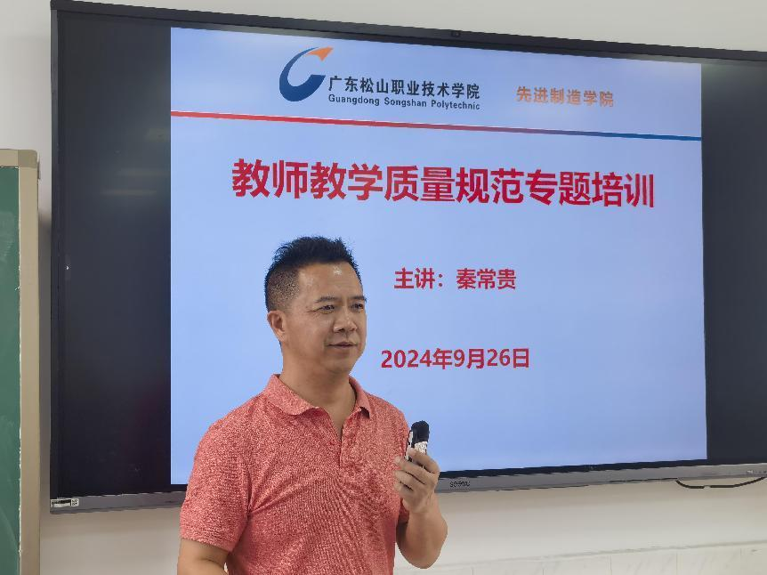秦常贵副教授向各位新入职教师详细讲解了《广东松山职业技术学院课堂教学质量评价实施办法(试行)》《广东松山职业技术学院“一期三检”教学检查实施方案》等教学质量管理文件。培训会上,秦常贵还向新教师传授了课件制作、教学工具使用和教学素材收集等教学技巧,以及如何通过日常教学提高自身的技术技能,起到了士则世范、德技双馨的传帮带作用。