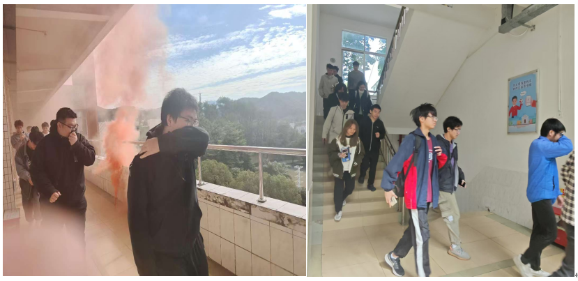 本次演练模拟宽字楼实验实训室突发火灾场景,警报拉响后,师生们迅速用手捂住口鼻,按照预定路线有序撤离。各楼层引导员坚守岗位,确保疏散过程安全、有序、高效,仅用3分钟,全体师生便撤离至安全区域,集合点名后无人员遗漏。
