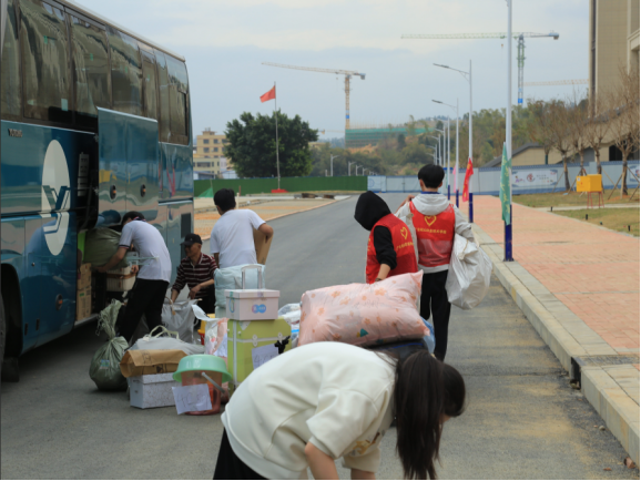 搬迁进行到一半时,韶关突降大雨,为行李搬运增添了一些困难。然而,阴雨天气并未阻挡学子们的热情。学院师生自发组成互助小组,党员先锋队、学生志愿者冒雨穿梭于宿舍楼与接驳车辆之间,帮助搬运大件行李、协调物资运输;辅导员全程值守,确保搬迁安全有序。雨水打湿了师生的衣衫,但互助的暖流在人群中涌动。这场特殊的搬迁行动,展现了师生团结协作的精神风貌,生动诠释了学院的团结、奉献、担当精神。