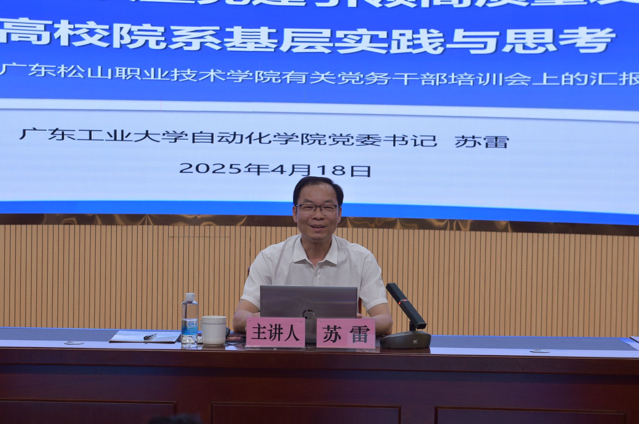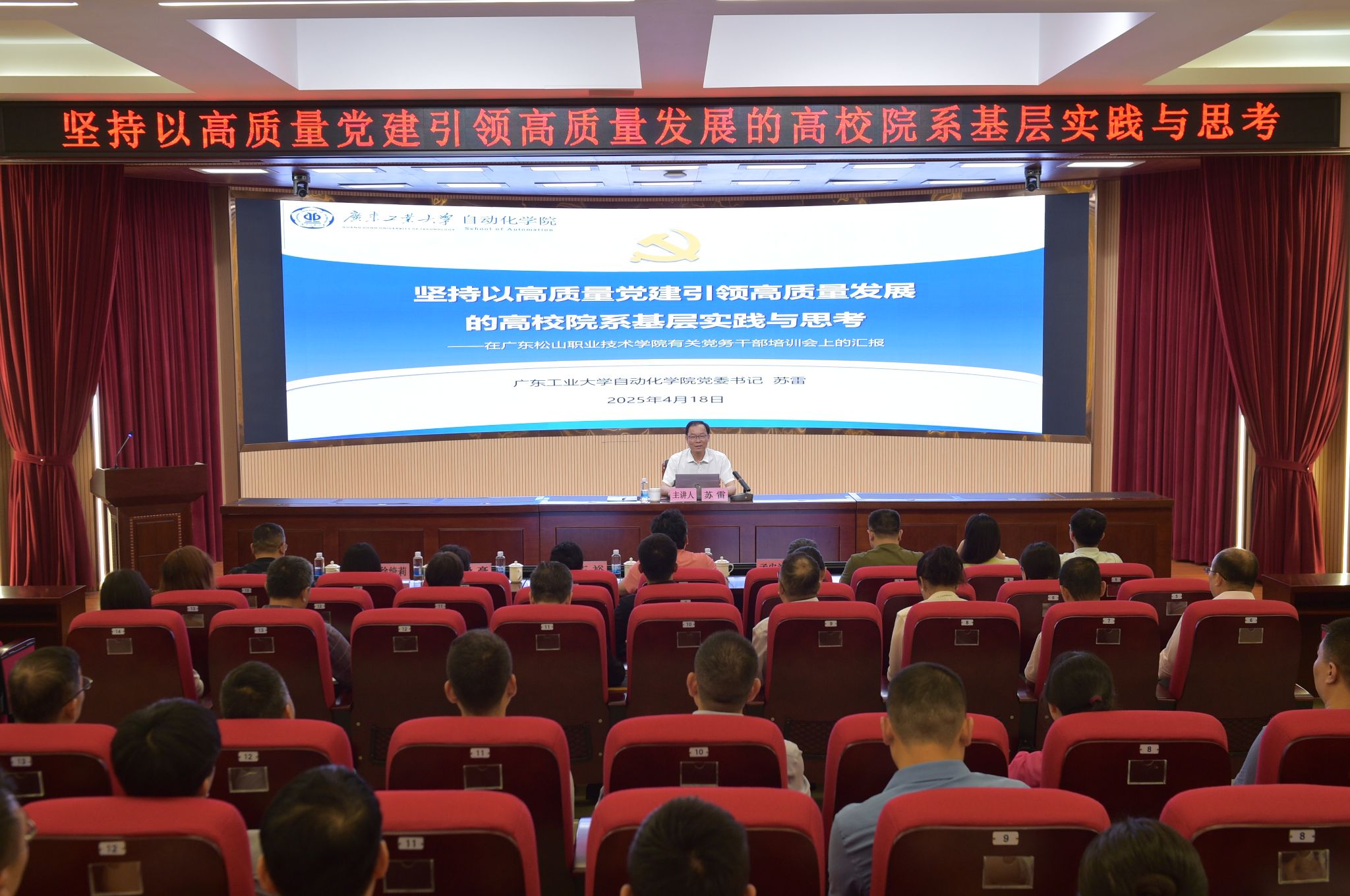 2025年4月18日下午,学校“党建工作坊”第一讲在宽C101报告厅精彩开启。本次活动特邀广东工业大学党委委员、自动化学院党委书记苏雷,以“坚持以高质量党建引领高质量发展的高校院系基层实践与思考”为主题,开展党建“双创”工作专题报告。报告会由学校党委组织部部长洪明刚主持。各党(总)支部书记、副书记、委员,组织员及全体辅导员参会。