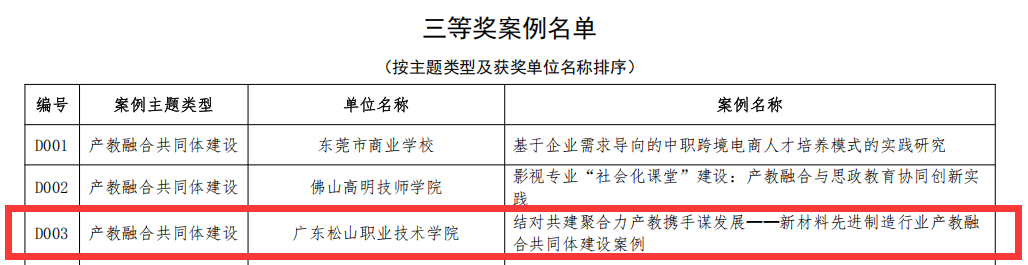 近日,由广东省职业学校教师发展中心开展2025年职业教育高质量发展经验做法和特色案例评选活动获奖名单揭晓,我校报送的作品《结对共建聚合力 产教携手谋发展——新材料先进制造行业产教融合共同体建设案例》获评三等奖。