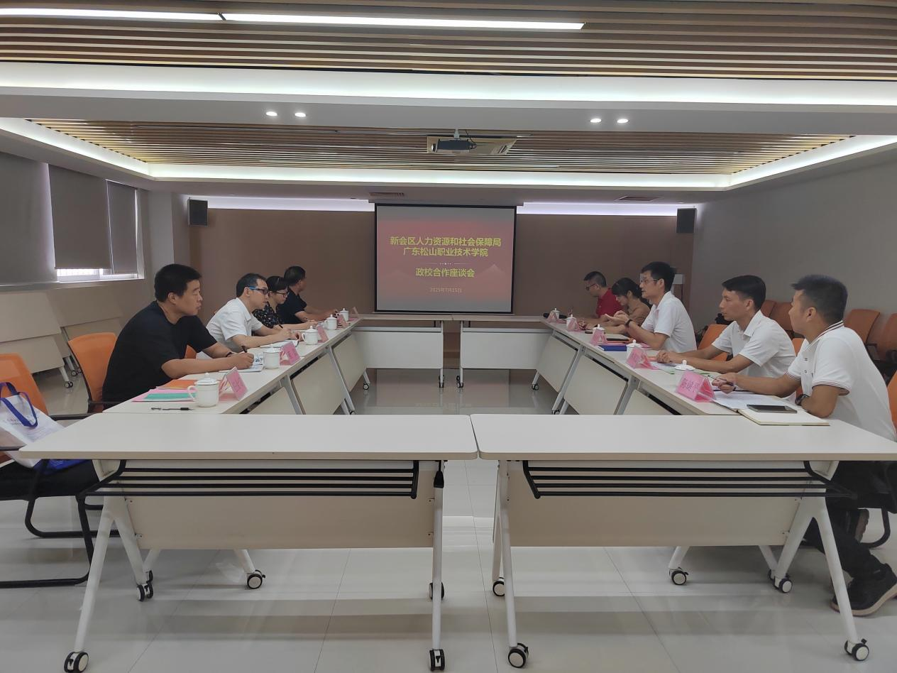 曾杰向新会区人社局长期以来对学校就业工作给予的大力支持表示感谢,详细介绍了学校的人才培养模式、学科专业特色以及毕业生就业情况。他表示,此行旨在了解我校毕业生留在新会工作的情况,调研新会企业用人需求,同时邀请辖区企业来学校组织参加招聘会。他强调,校政企合作能够发挥学校、地方政府和企业的各自优势,共同培养适应市场需求的人才,希望双方能够开展更深层次、更高质量、全方位的交流合作,建立长效的沟通合作机制,实现政校企发展深度融合,为高校毕业生就业以及助推地方经济社会发展做出更大贡献。
