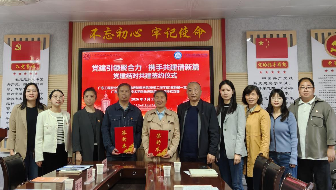 交流结束后,双方举行党建结对共建签约仪式。广东工程职业技术学院先进制造学院(电梯工程学院)教师第一党支部、学生第一党支部分别与学院教师党支部、学生党支部结对共建。双方党支部书记表示将落实共建协议,创新形式、丰富内涵,共促党建与人才培养质量提升,合力打造校际党建共建标杆。