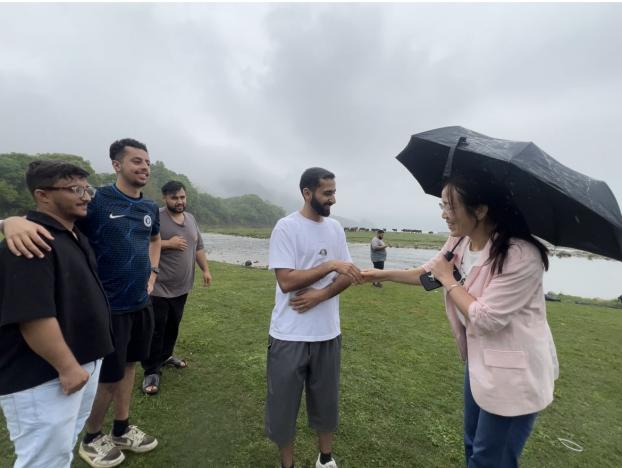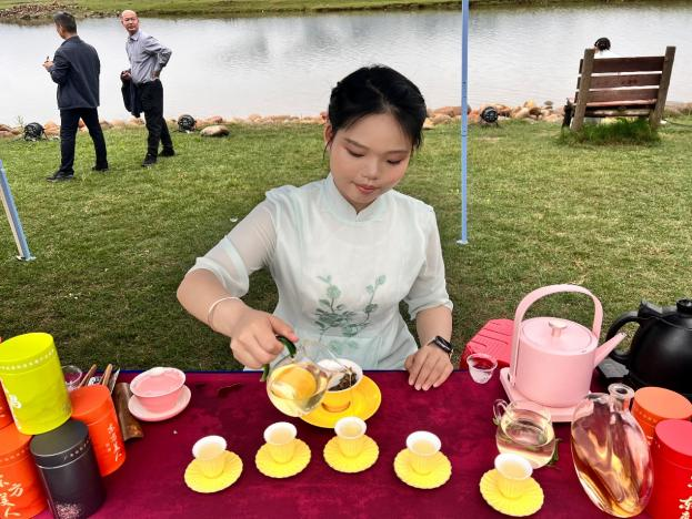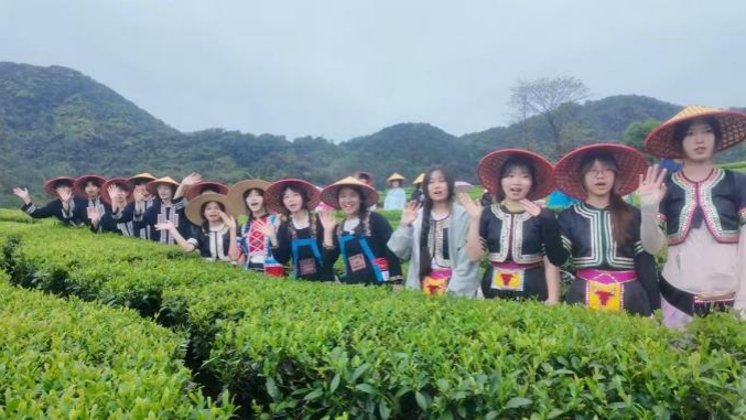 活动中,文化旅游学院近百名师生,深度融入采茶节各特色环节。师生身着瑶族服饰,跟随当地茶农走进梅山生态茶园,全程参与传统采茶节“喊山开茶”仪式,在“发芽喽”“开采喽”等嘹亮呼声中,沉浸式体验本土采茶习俗,感受罗坑茶的历史底蕴与春日茶事魅力。师生团队还对多家重点茶企开展专题采访,与罗坑茶制茶技艺非遗传承人、茶企负责人深入交流,围绕茶品品质、品牌定位、市场推广等核心内容挖掘产业发展一线动态,为学校专业教学精准对接地方产业需求积累鲜活实践素材。采访中,师生还与前来观光的也门籍国际友人开展友好交流,借机系统推介韶关本土茶产业,传递推动罗坑茶叶走出国门、拓展海外市场的美好愿景。此外,师生代表现场开展沉浸式传统茶艺展演,以娴熟技法呈现茶艺全流程,并向现场群众科普茶叶品鉴、茶具使用、茶事礼仪等知识,让中华传统茶文化在互动中得以传播,获现场观众一致好评。