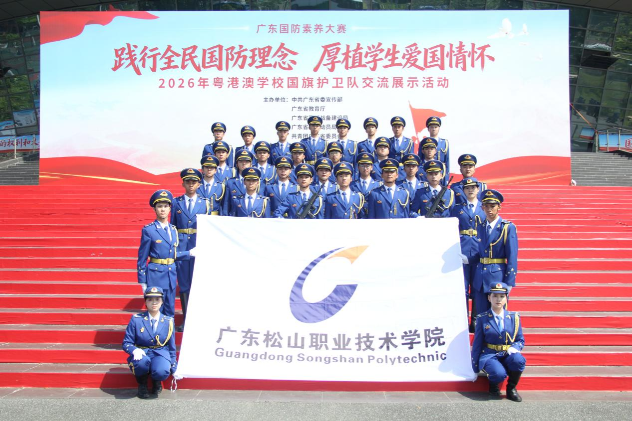 为深入贯彻落实立德树人根本任务,厚植青年学生家国情怀,4月24日至26日,由中共广东省委宣传部、广东省教育厅、广东省军区战备建设局、广东省军区动员局、共青团广东省委员会等五部门联合主办的2026年粤港澳学校国旗护卫队交流展示活动在佛山大学仙溪校区成功举办。本次活动是粤港澳大湾区校园国防教育领域规格最高、规模最大的年度盛会,吸引近165所学校国旗护卫队同台竞技、一展风采。我校国旗护卫队以精湛的队列素养、严明的纪律作风和昂扬的精神状态惊艳赛场,最终斩获高职组二等奖,用铿锵步伐诠释爱国初心,以青春风采彰显松山担当。